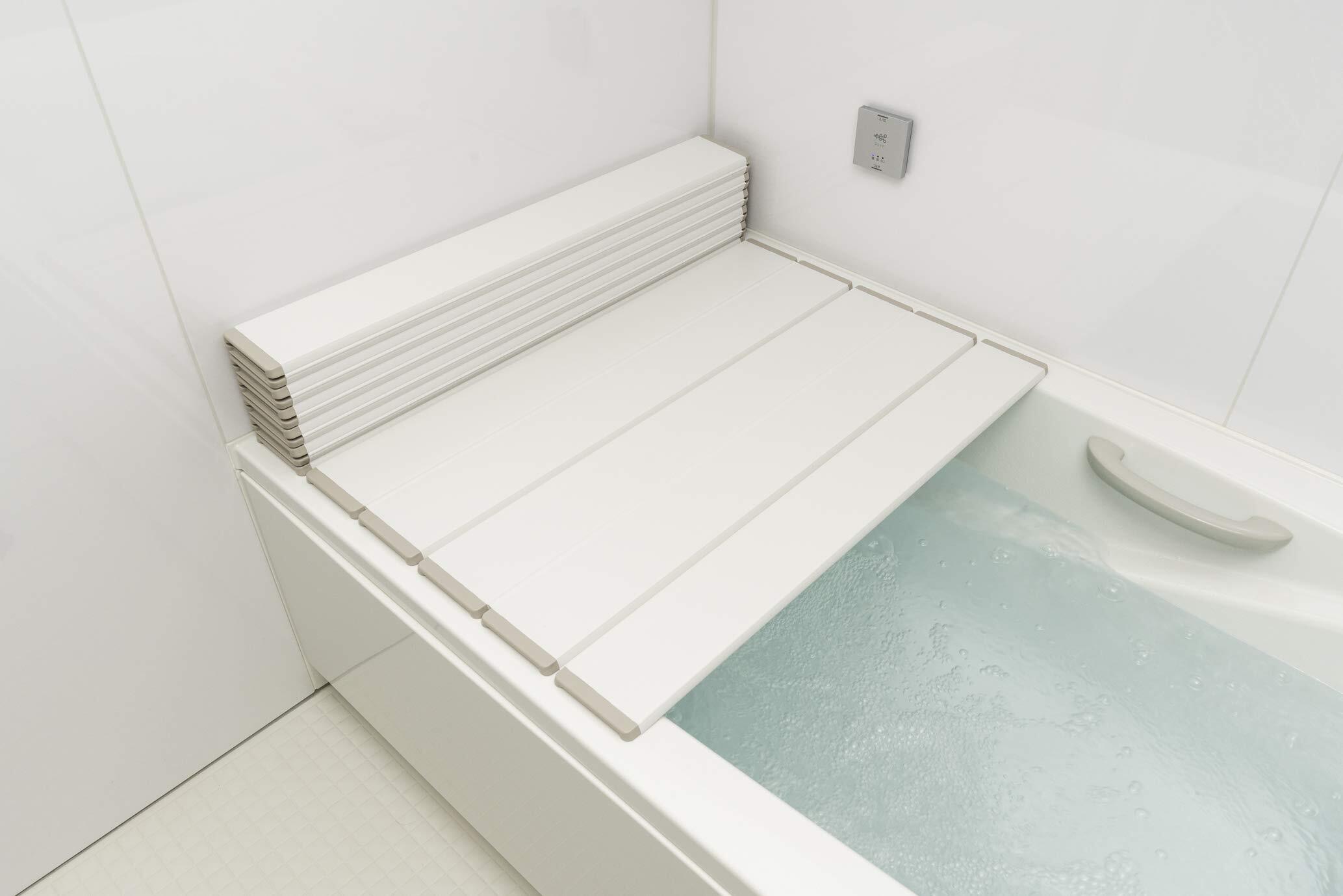 ●溝を約7割減らし(当社従来品対比)、蛇腹状シャッター(シャッター式)ふたの不満を解消した折りたたみ風呂ふたは、広げた状態でフラットになるので掃除も簡単です。