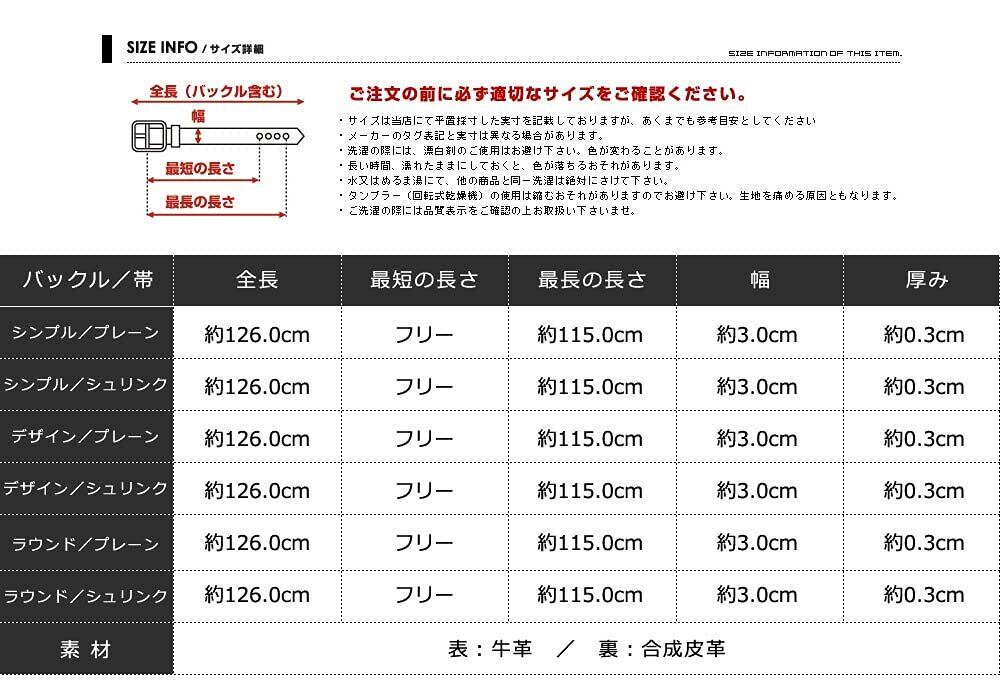 【簡単⾧さ調節可能】ベルトの裏に間隔約5mmの溝(レール)があるので締まり具合を微調整できます。ベルトの裏に溝(レール)があり、その部分をバックルで挟み込みロックするという仕組みです。 取り外す際はバックルを持ち上げる事で、ロックが簡単に解除されます。 穴がない事によって固定点周辺の革がヘタレないのが嬉しいポイント。 耐久性も安心頂けます。またバックルをはずし、帯をハサミでカットする事によって簡単にサイズを調整可能です。
