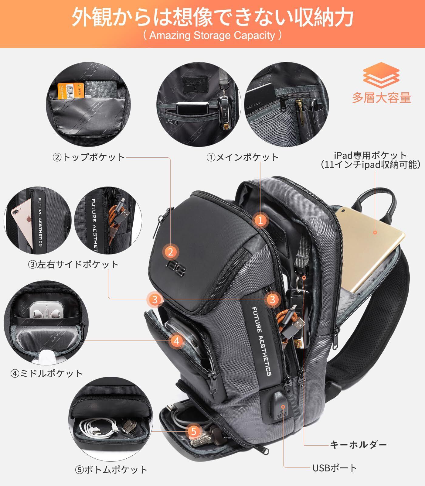大容量多機能ボディバッグ:ポケットが小さめ大きめなど多数あるので、仕分けやすく取り出しやすいです。11インチiPad専用ポケット、手帳・ペン・財布などの小物はサブポケットへ、折り畳み式傘、書類・B5ファイル・衣類などはメインポケットへ、600ml水筒はサイドポケットに入れます。日常必要なアイテムをひとまとめにして楽々に持ち運べます。