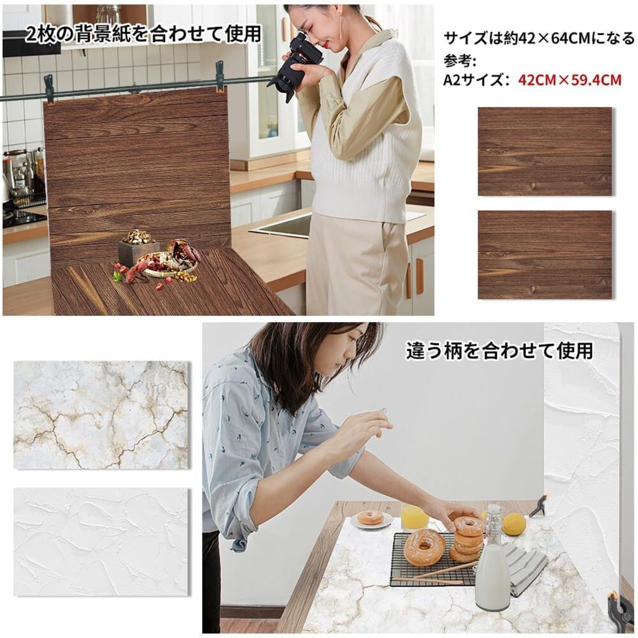 【注意事項】表面にフイルムで覆われて、やや防水できまが、縁部分は防水できませんので、ご使用の時はご注意ください。汚れがあるとき乾いた布で軽く拭いてください。撮影背景シートを耐熱加工を施しておりません。熱食物の撮影にお勧めいたしません。