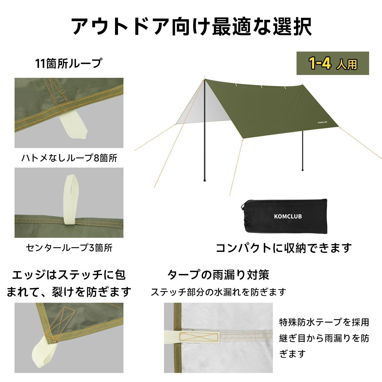 KOMCLUB タープ 11箇所ループ 3m*3m 特殊防水テープ付き uvカット 遮熱 遮光 シルバーコーティング ポリエステル生地 3000mm 耐水圧 撥水加工 ポール·ロープ·ペグ付き 軽量 コンパクト 収納袋付き キャンプ グリーン