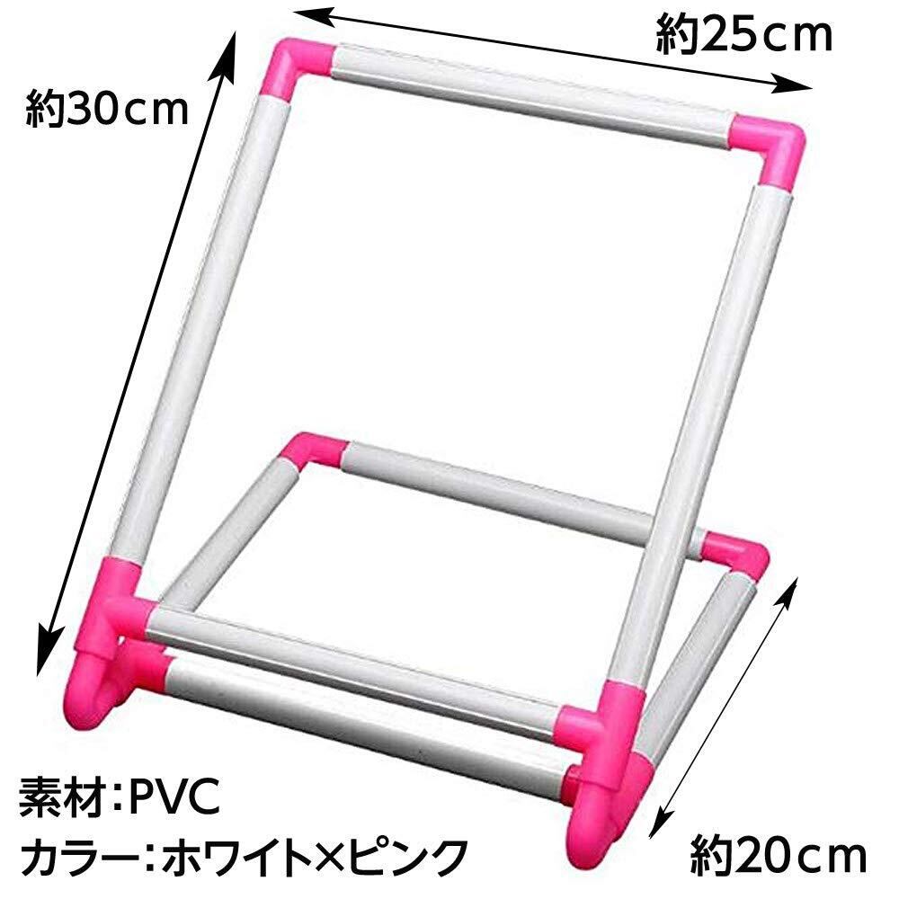 四角形の刺繍フレームスタンド:横幅がおよそ25cm、縦がおよそ30cmの刺繍スタンドです。ピンク色の接合部分と合わせるともう少し大きなサイズ感になります。スタンドタイプなので両手で作業でき、刺繍を長時間楽しめます。