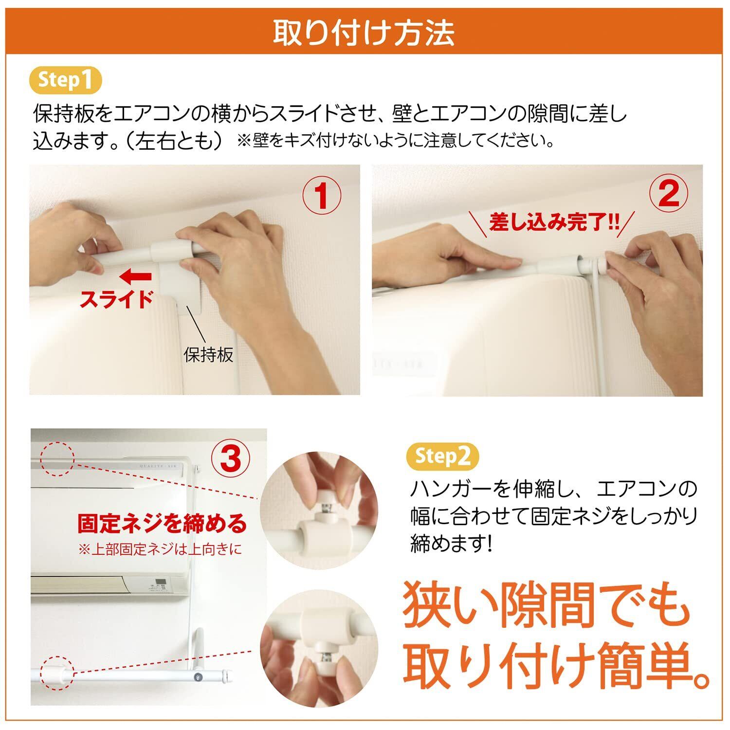 ●商品詳細:エアコンの幅に伸縮させ調節することができます。エアコンの幅に合わせて調整可能で、今まで壁があって取り付けできなかった等の悩みを解決する伸縮タイプのエアコンハンガーです。(※幅はエアコン横面から6cm以上は必要です。)エアコンに引っかけるだけの簡単設置できます。使用後は折りたためるので邪魔になりません