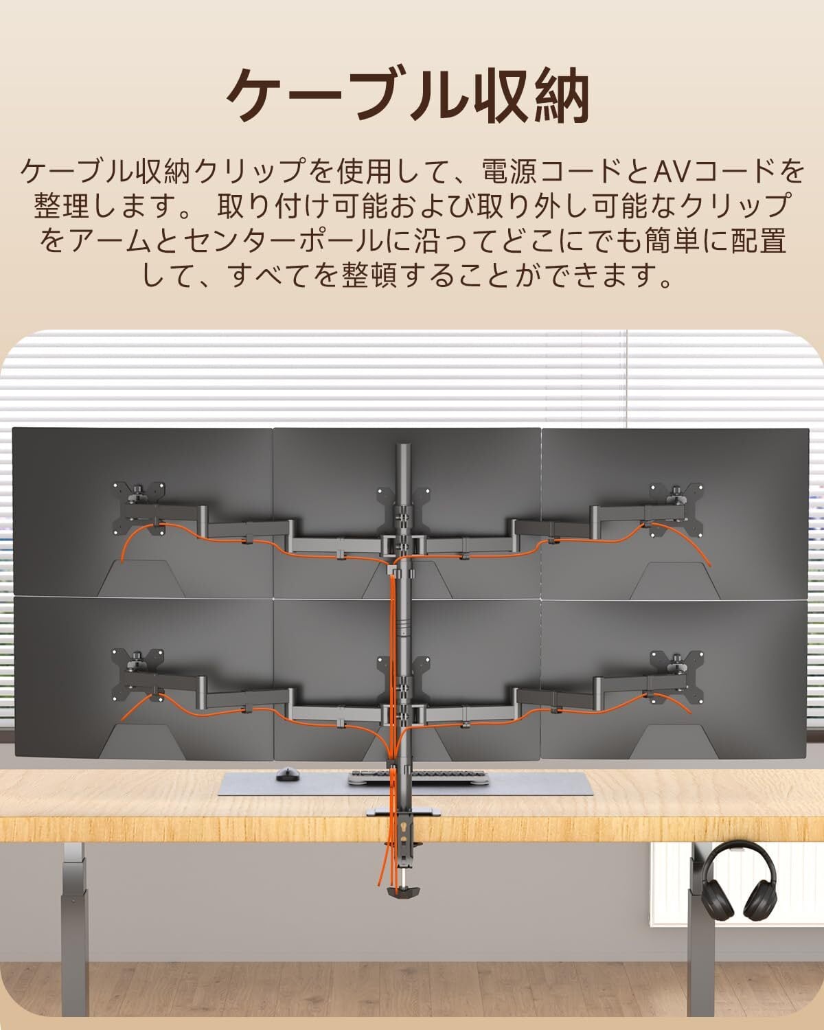 互換性:液晶モニターを6台設置できるモニターアームです。耐荷重:10kg(一台)▶対応モニターサイズ:13-27インチ▶VESA規格:75×75mm、100×100mm▶固定方式:クランプ式