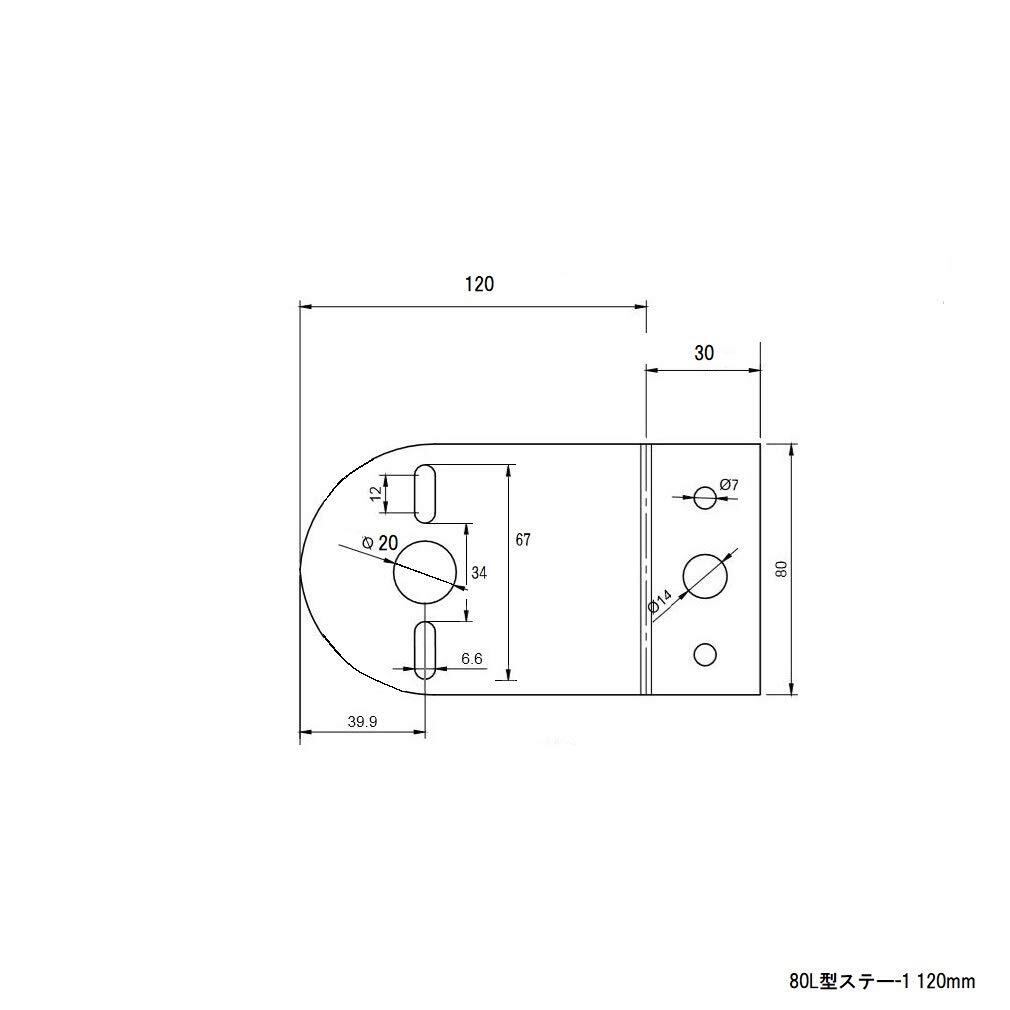 サイズ:幅80mm、長さ120mm、折り曲げ部分:タテ幅 30mm ヨコ幅 80mm 取付け部穴:3ヶ所 マーカーボルト幅:67mmまで対応