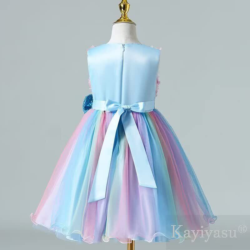 Kayiyasu ドレス 子供 ピアノ 発表会 入園式 女の子 虹色 スパンコール蝶結び 花柄 丸ネック フォーマル 卒業式 ガールズ 誕生日 3-13歳