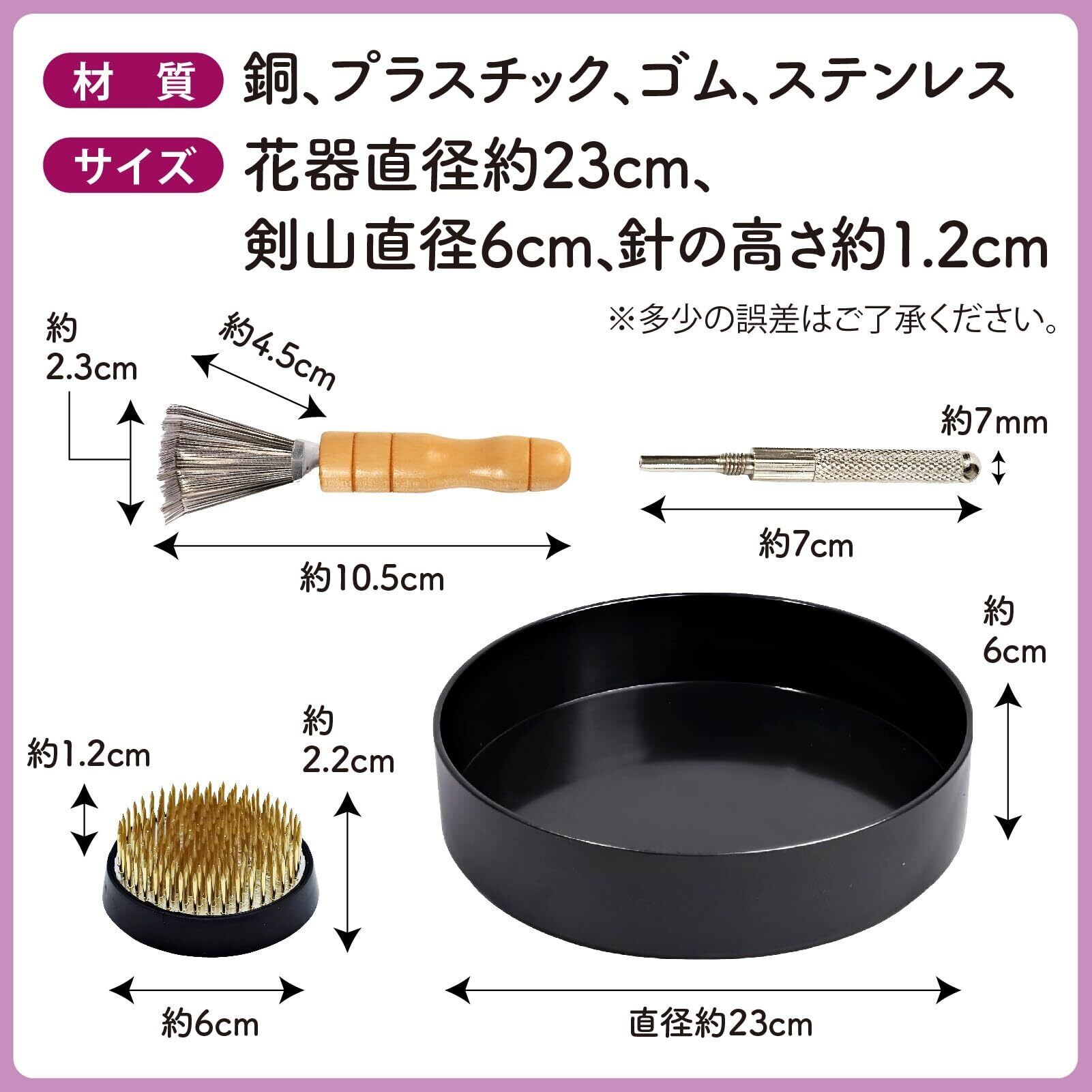 【サイズ】 花器直径約23cm、剣山直径6cm、針の高さ約1.2cm、矯正器約7cm、クリーナー約10.5cm ※多少の誤差はご了承ください。 【素材】 銅、プラスチック、ゴム、ステンレス 【商品重量】 花器:約181g、剣山;約254g、矯正器:約13.2g、クリーナー:約11g【内容】 1セット ※取扱説明書は付属しておりません。