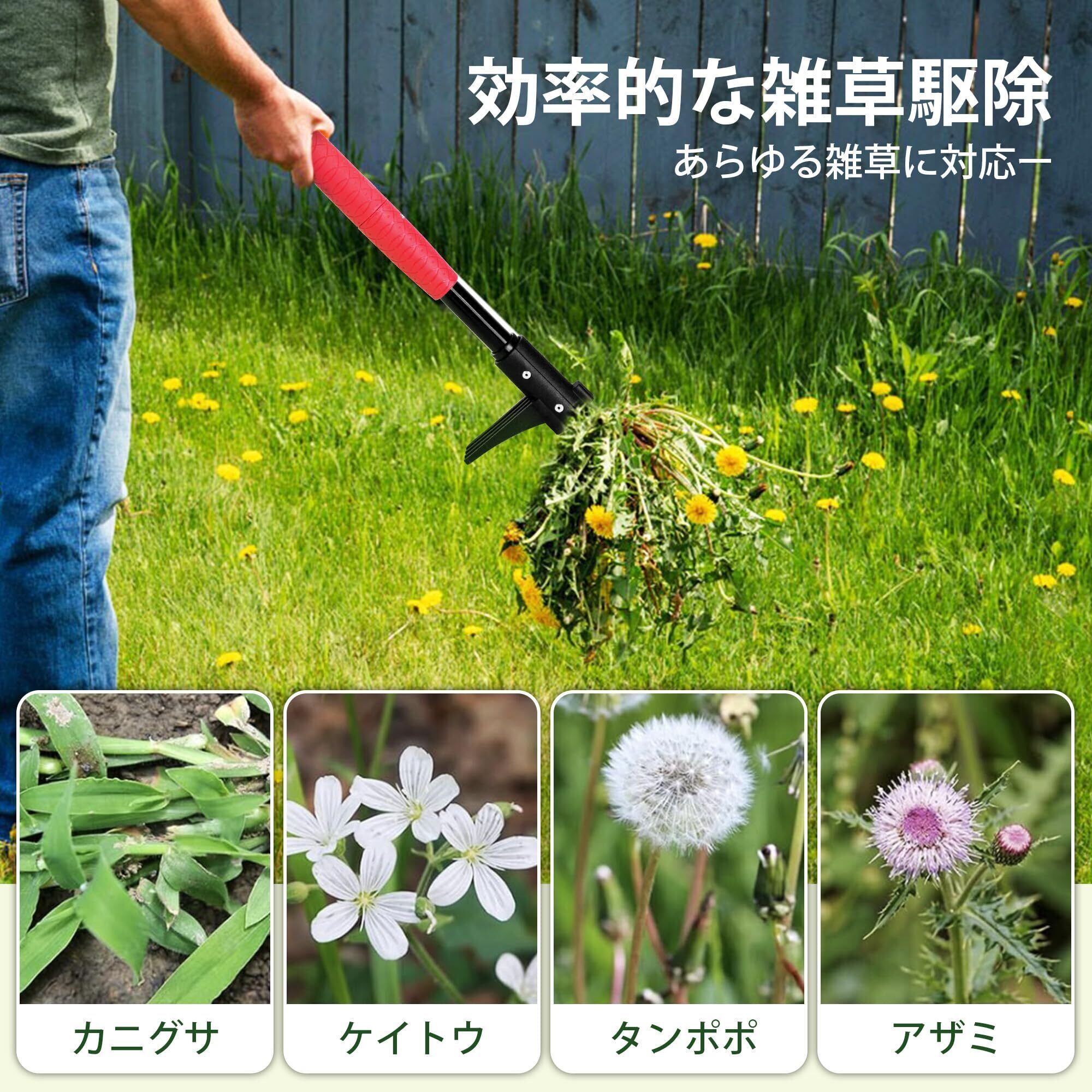 【効率的な作業と負担軽減】回転式草取り器は、作業時間と手間を大幅に削減し、体への負担を軽減します。柄の長さを調節できるため、立ったままでも楽に作業が可能。軽い力で根元から雑草を抜くことができ、腰痛や関節の痛みを予防しながら、効率的に草むしりができます。