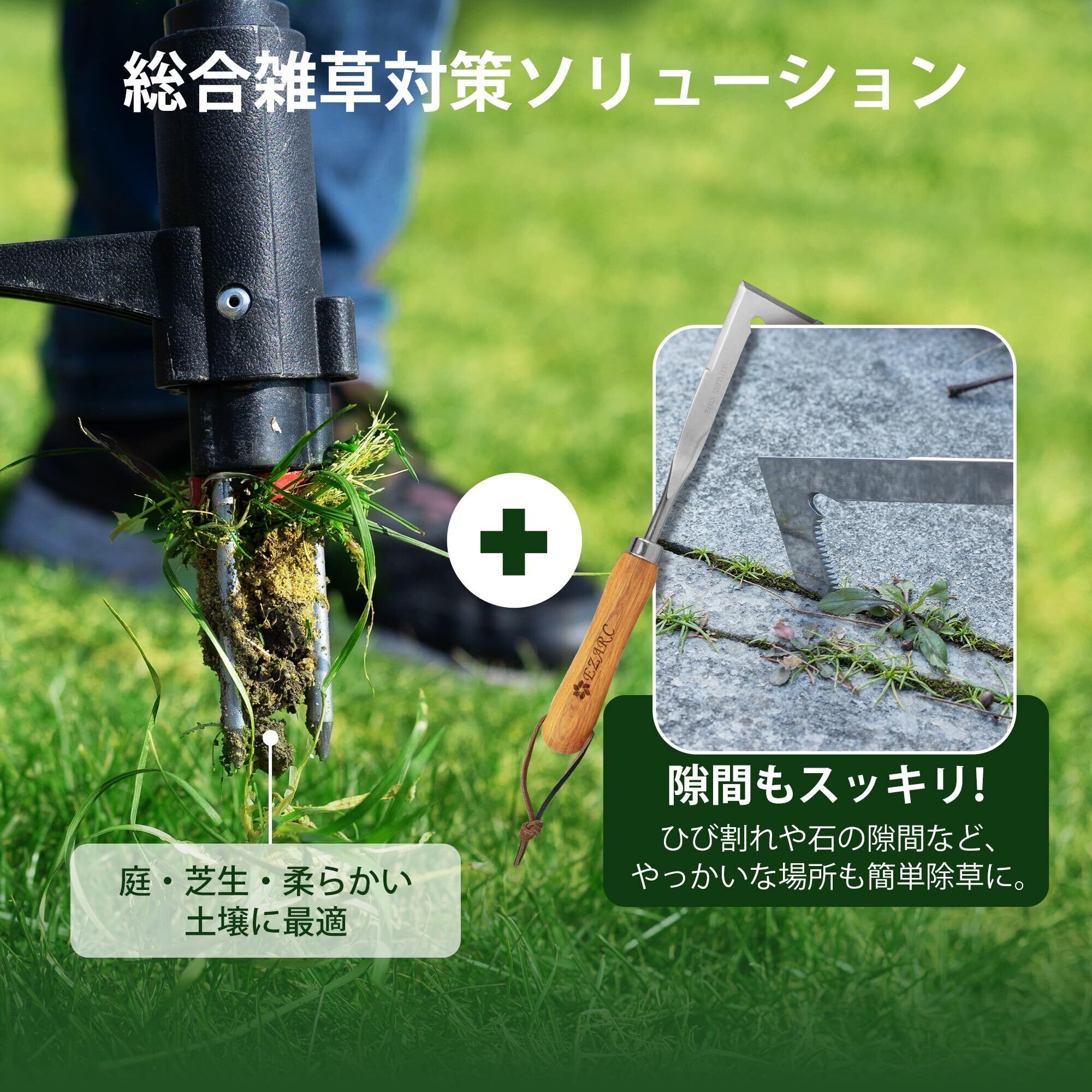 【芝生や景観を傷めずに作業】雑草の周りに生えている芝を傷めずに抜けるため、ガーデニングや景観が気になる場所でも安心して使用できます。スコップとは違い、抜いた後の穴が目立ちにくいので、お庭の美観を保ちながら雑草処理が可能です。