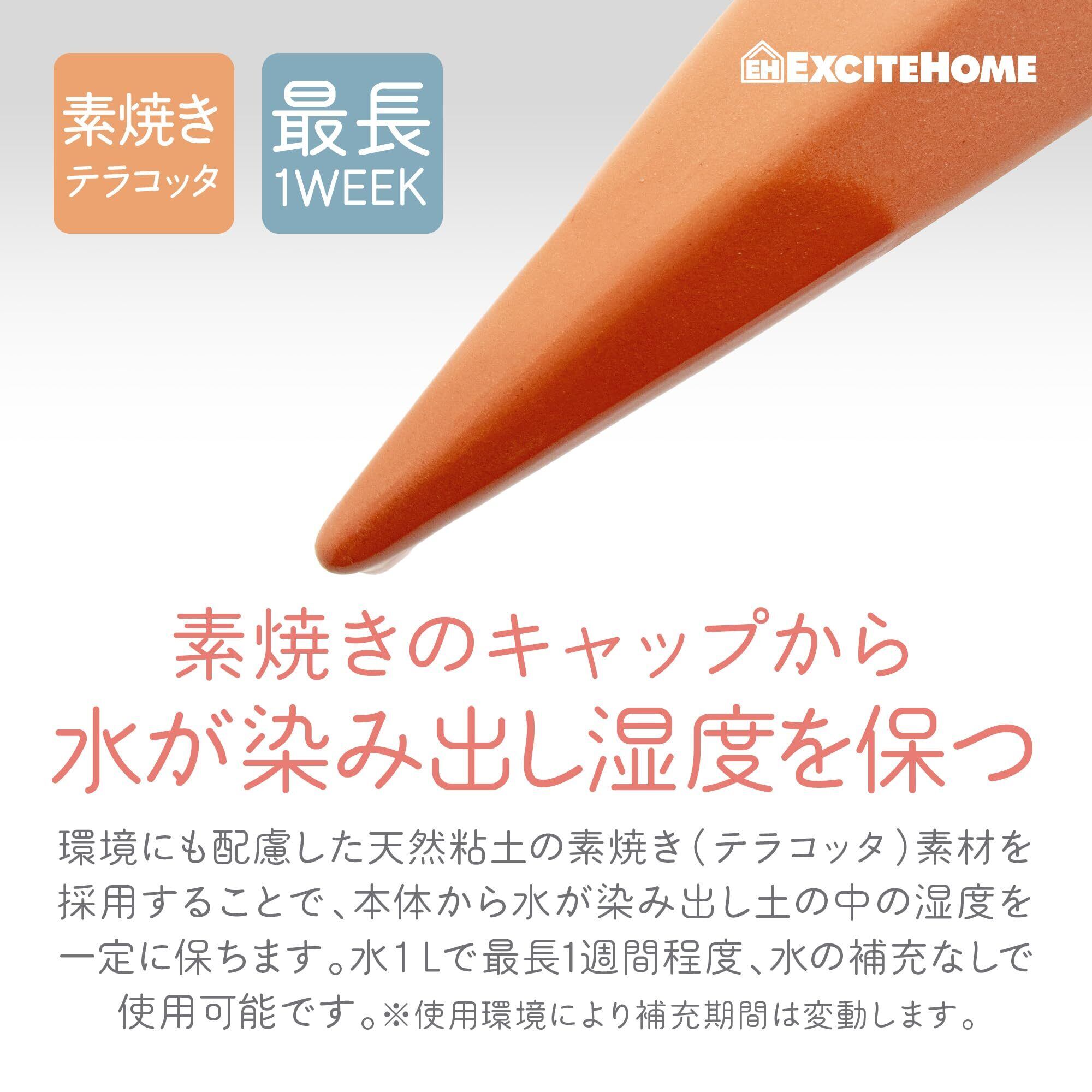 【陶器から水分が浸透】 環境にも配慮したテラコッタ素材を採用。土が乾くと自動的に水が染み出す仕組みなので、土に含まれる水分量に応じて自動的に給水量が調整されます。土を適度な湿り具合に保ってくれるので、水のやり過ぎ防止にも役立ちます。 ブラウンカラーのシンプルな陶器で、植木や植物の美しさを邪魔することなく使用できるのも魅力の一つです。
