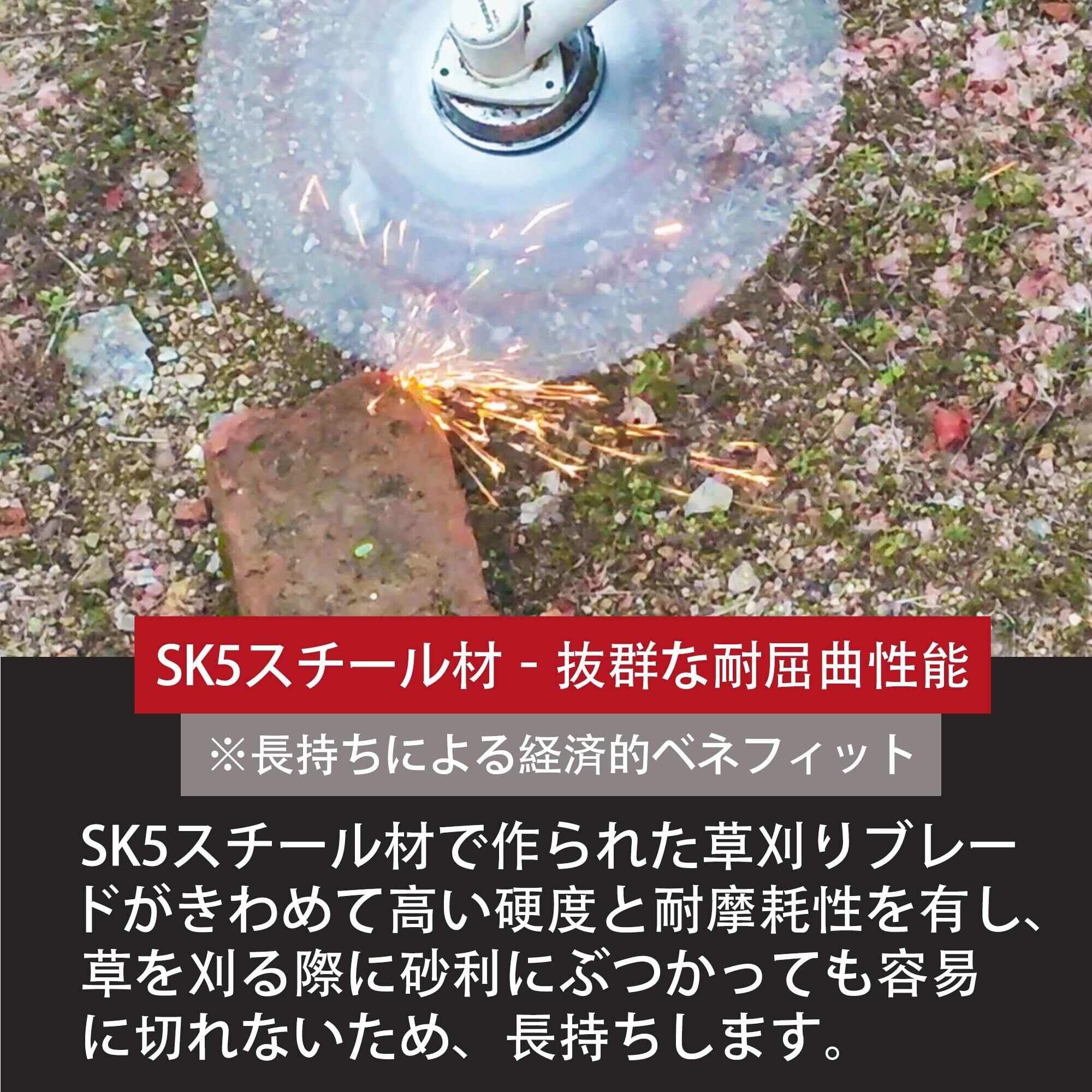 【高耐久性SK5鋼製】当社の草刈り機替え刃は、市場の一般的な製品よりも硬度が高く、優れたSK5鋼を使用して製造されています。石に幾度となく衝突しても摩耗が少なく、長期間にわたり使用可能です。
