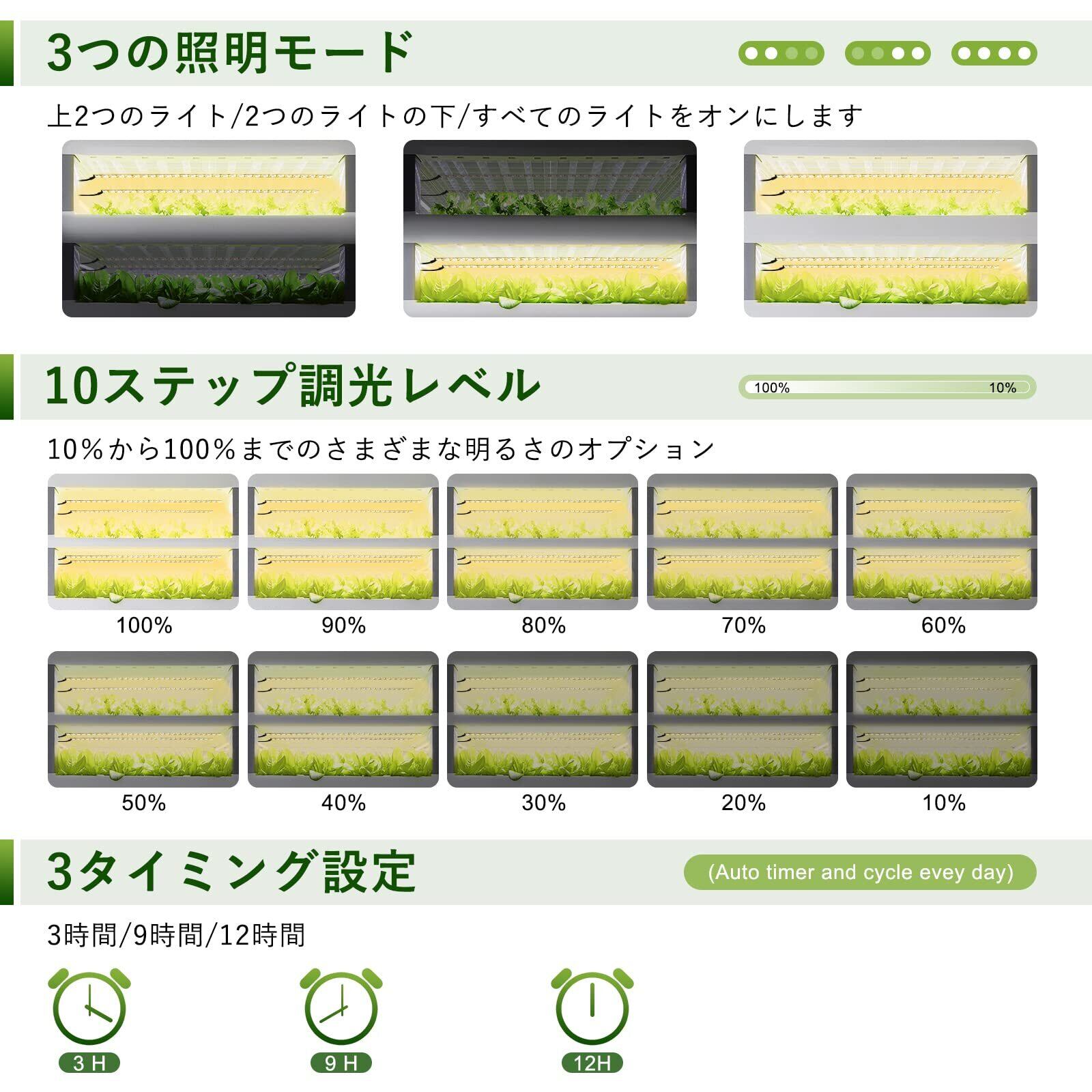 【タイマー機能 & 24時間サイクル】植物ライトは3/9/12Hタイミングに対応しており、留守中でも消費電力の心配がない。もし電源切れましたらもう一度タイマー時間設置必要です。操作は簡単で、日本語の取扱説明書がついています。