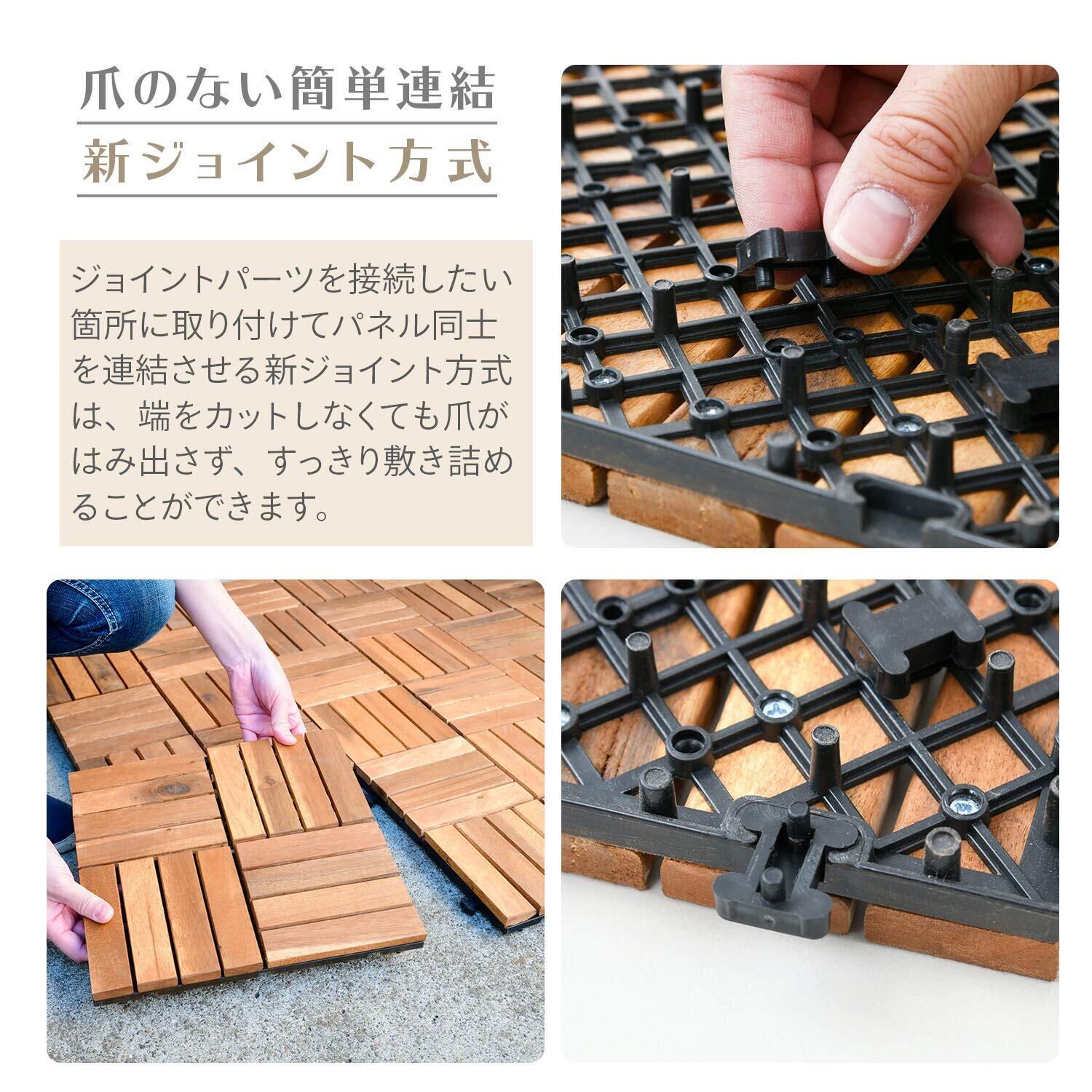 【特徴】耐久性に優れたアカシア材使用した、天然木ウッドパネルの30枚セット(分割タイプ:16分割)です。コンクリート造りの殺風景なベランダがスタイリッシュで素敵な木製デッキに変わります。天然木のパネルは木の温もりがあり、見た目にもおしゃれです。ジョイントパーツを接続したい箇所に取り付けてパネル同士を連結させる新ジョイント方式なので、端をカットしなくても爪がはみ出さず、すっきり敷き詰めることができます。