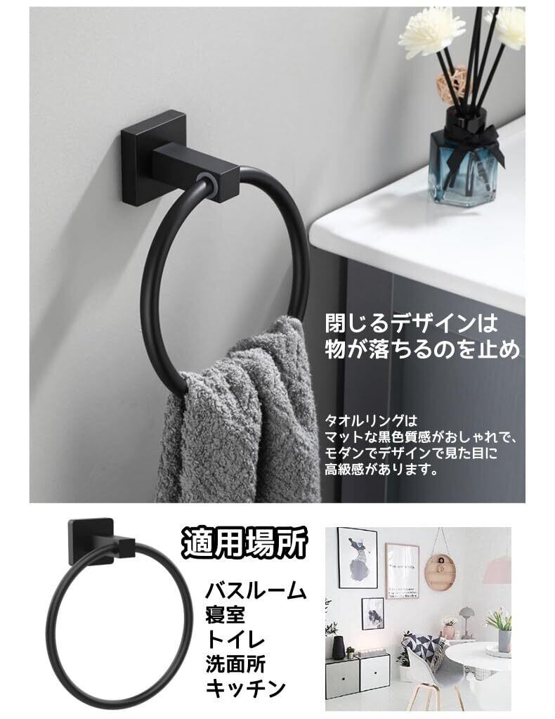 タオルリング 16cm ステンレス タオル掛け タオルハンガー 壁掛け おしゃれ シンプルモダン タオルホルダー タオルかけ 収納 トイレ浴室 洗面所 キッチン お風呂用 ブラック ネジ付き