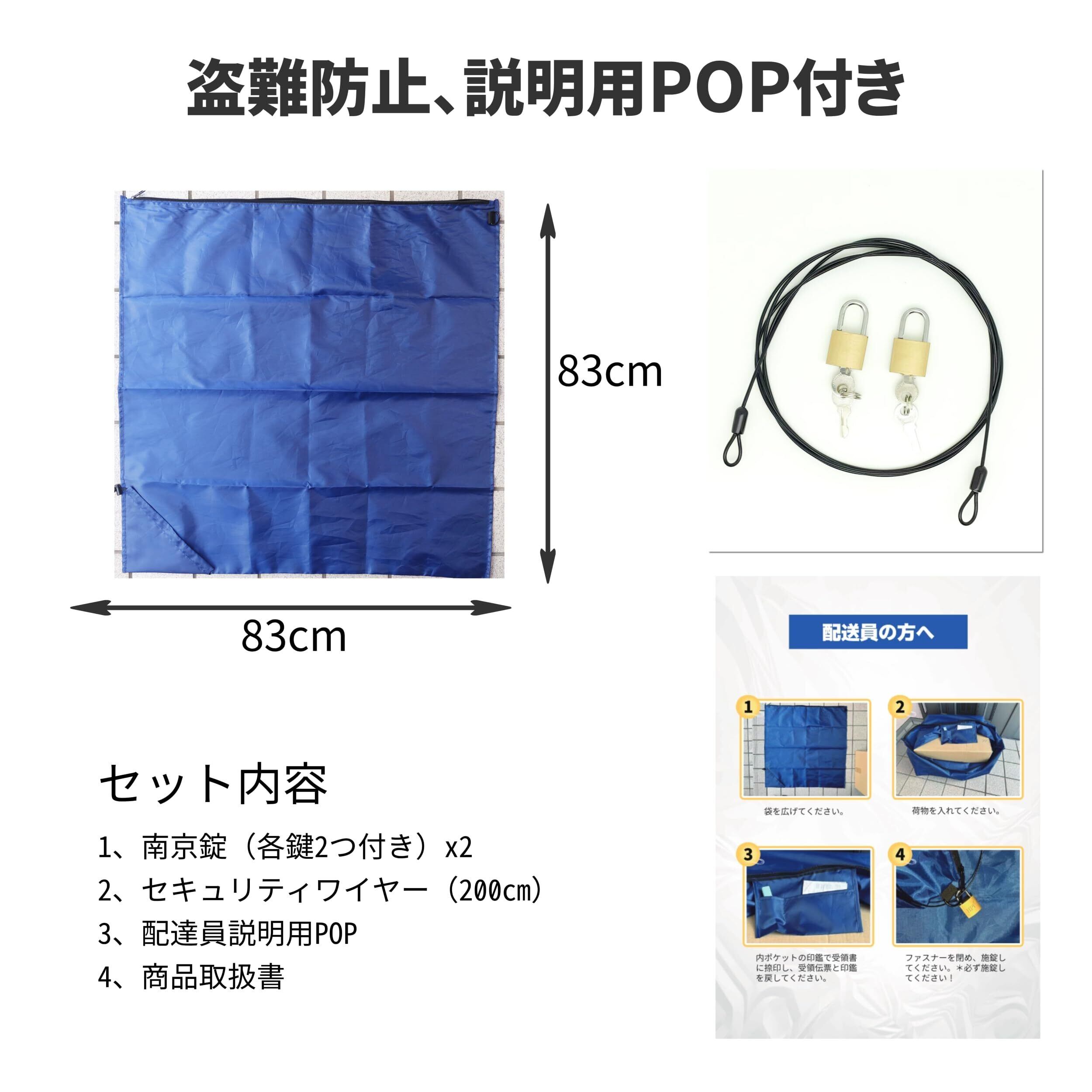 大容量設計: バッグ使用時約50x50x32cm、 約80Lの収納力で、大きな荷物もしっかり保管できる宅配ボックスです。材質:コ-デュラリップ素材ナイロン(撥水加工)、約145g。