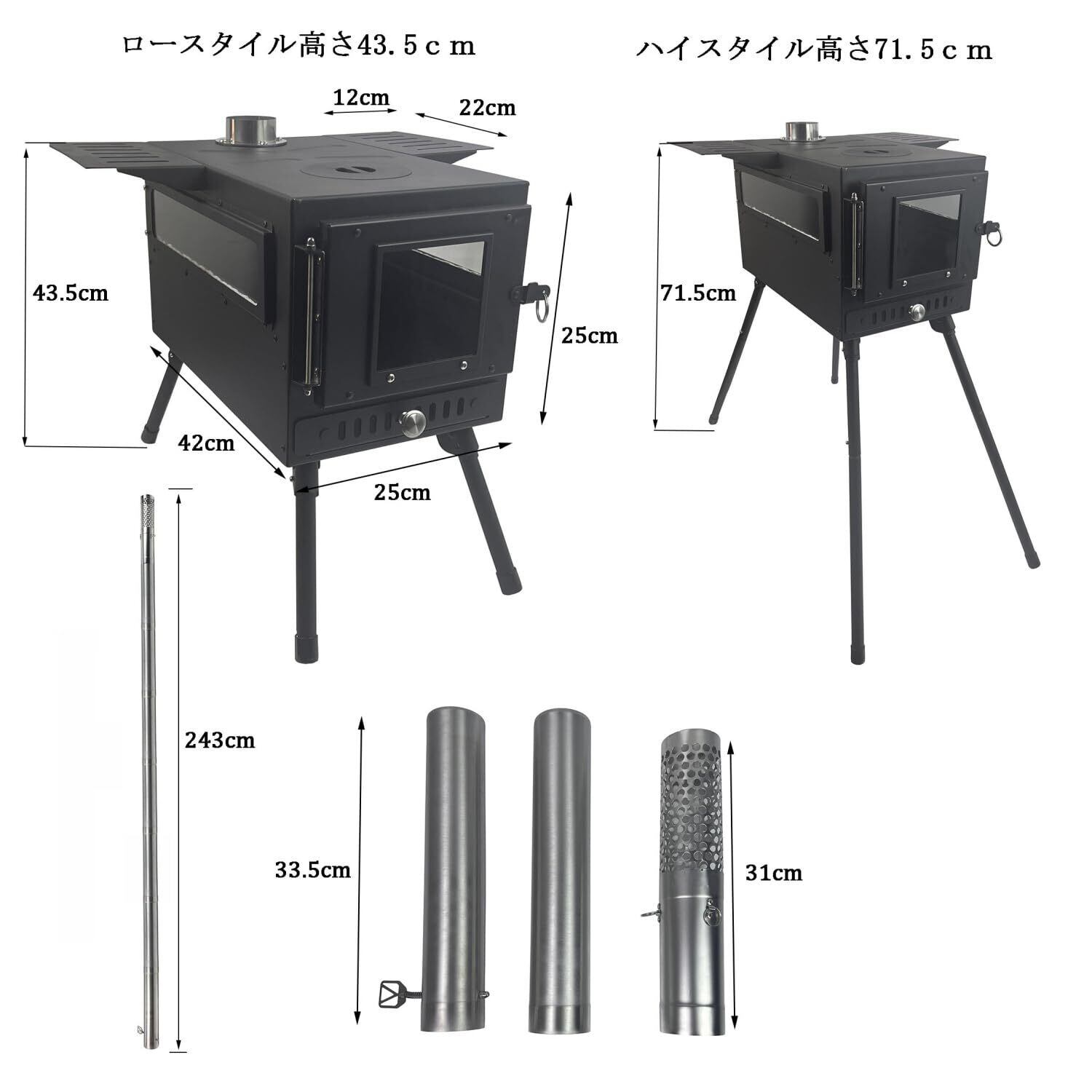 脚部延長:ロースタイル高さ43.5cm、ハイスタイル高さ71.5cm セット内容:本体*1 棚*2、収納バッグ*1、煙突*6、ダンパー付煙突*1、煙突蓋*1、 スパークアレスター*1脚延長パイプ*4。