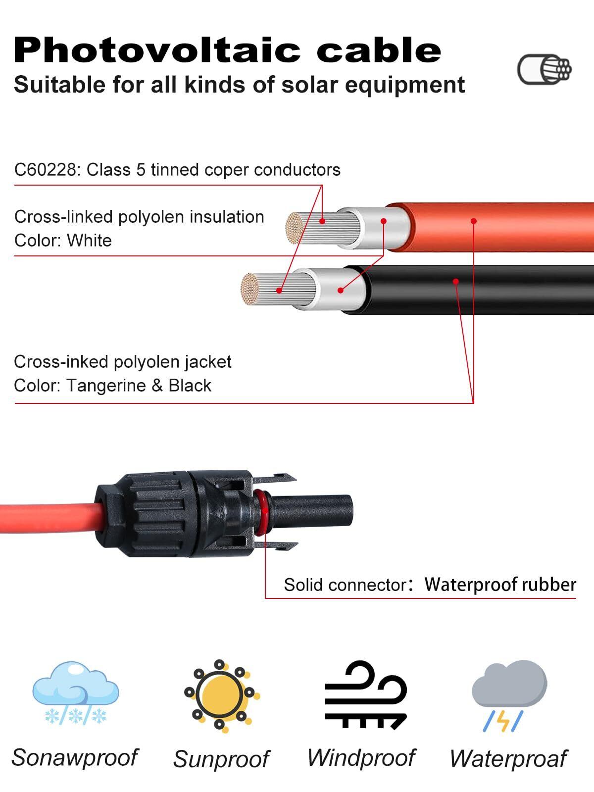 【特性】純銅材TUV認証、端子はソリッドPIN針、 MC4コネクター 高品質の錫メッキされた純銅線コアでできており 優れた温度特性を持つ、-40 ~ + 90℃の動作温度範囲耐環境ソーラーパネル 並列ケーブルです。 悪環境で太陽光発電設備を設置しても信頼性の高い接続を提供できます。