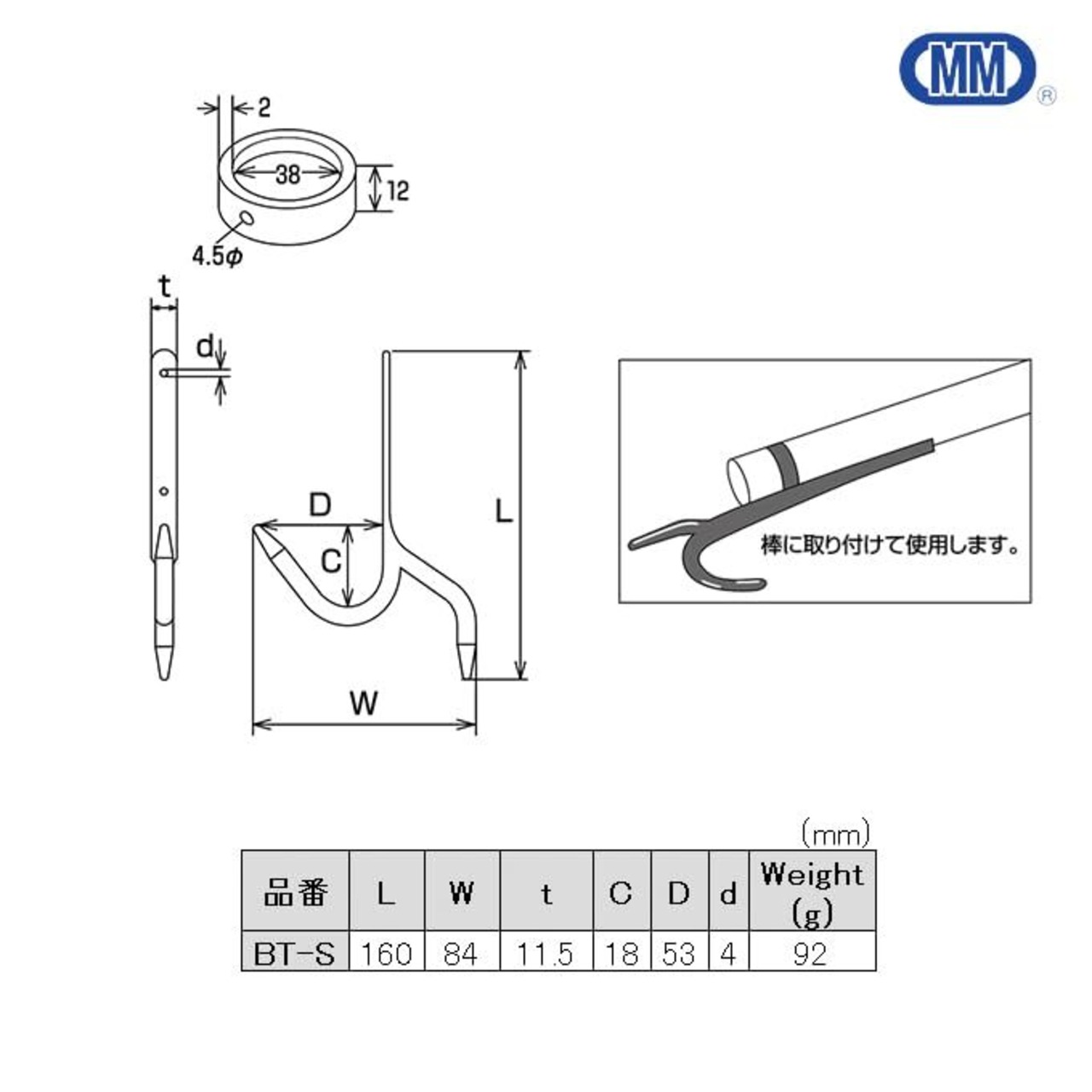 ●L(mm):160 ●W(mm):84 ●t(mm):11.5 ●C(mm):18 ●D(mm):53 ●d(mm):4 ●Weight(g):92 ●材質:ステンレス(SUS304)
