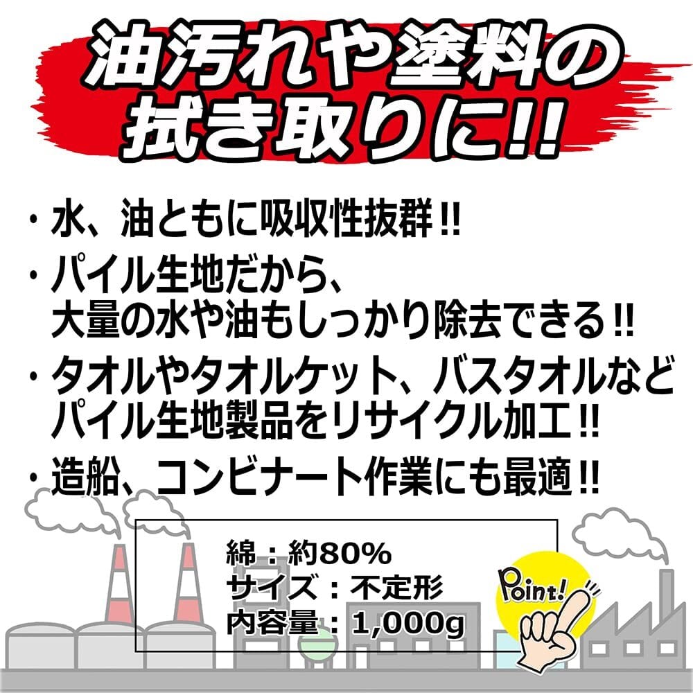 ・タオルウエスは、タオルやタオルケット、バスタオルなどのパイル生地でできている、生地を選別して裁断加工しており、大量の水や油もよく吸い取る