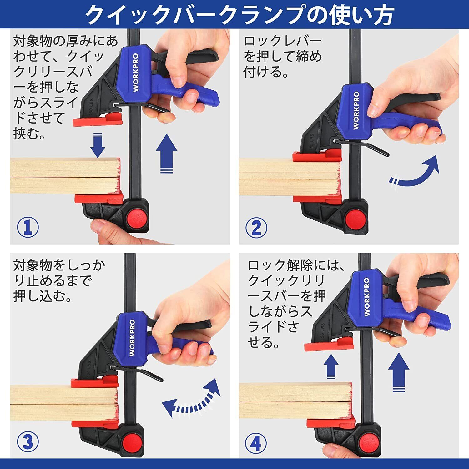 WORKPRO クランプ Fクランプ クイックバークランプ 120mm&150mm 4本組 最大締付力約23kg&68kg 1セット2役 クイックリリースレバー 滑り止め 樹脂保護パッド付き 木工作業 木材 強力固定 接着 溶接 切削 DIY工具