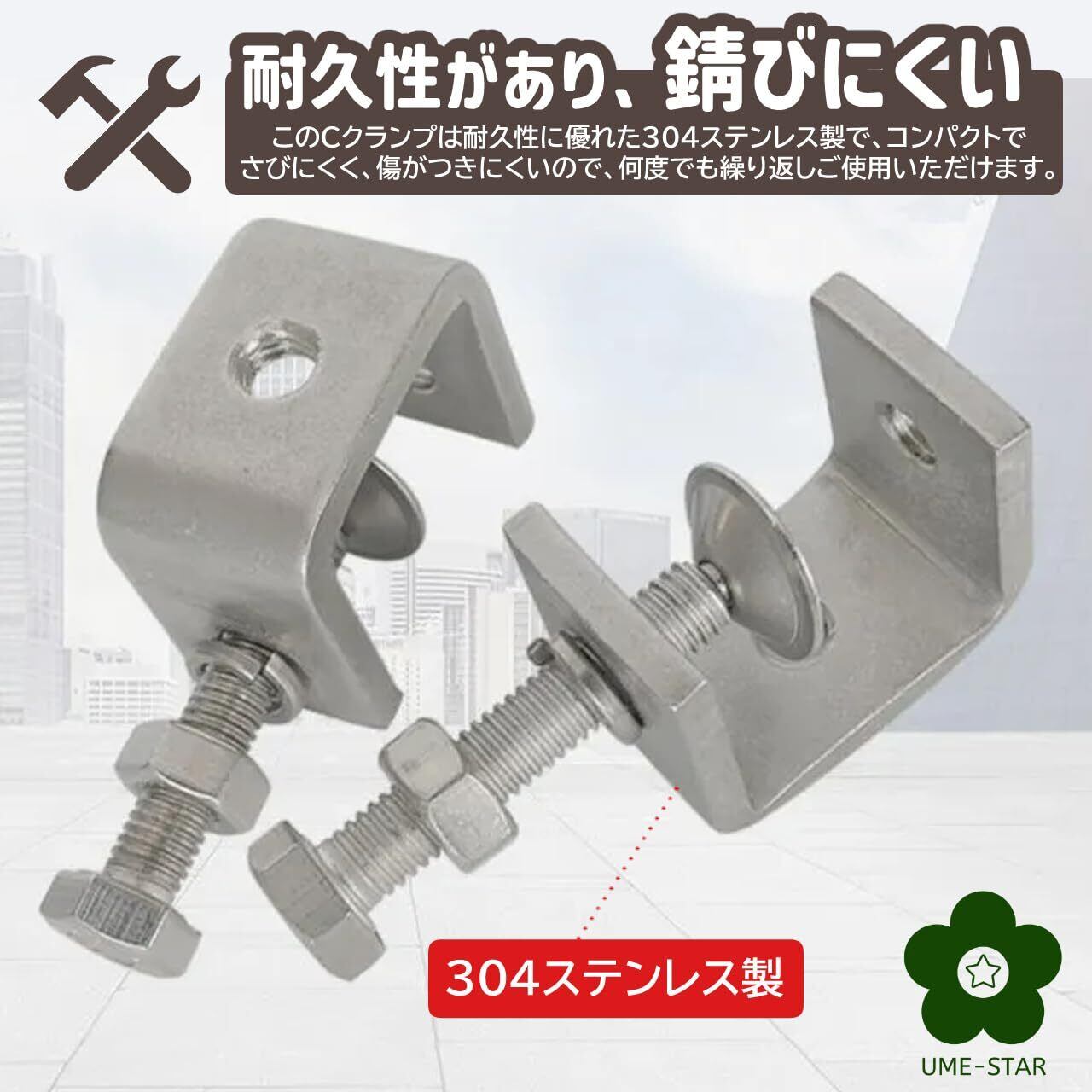木材、金属板などを組み立てたり、接着したり、溶接したりする作業の際、固定するのに便利なC型クランプです。 このCクランプは耐久性に優れた304ステンレス製でコンパクトでさびにくく、傷がつきにくいので、何度でも繰り返しご使用いただけます。