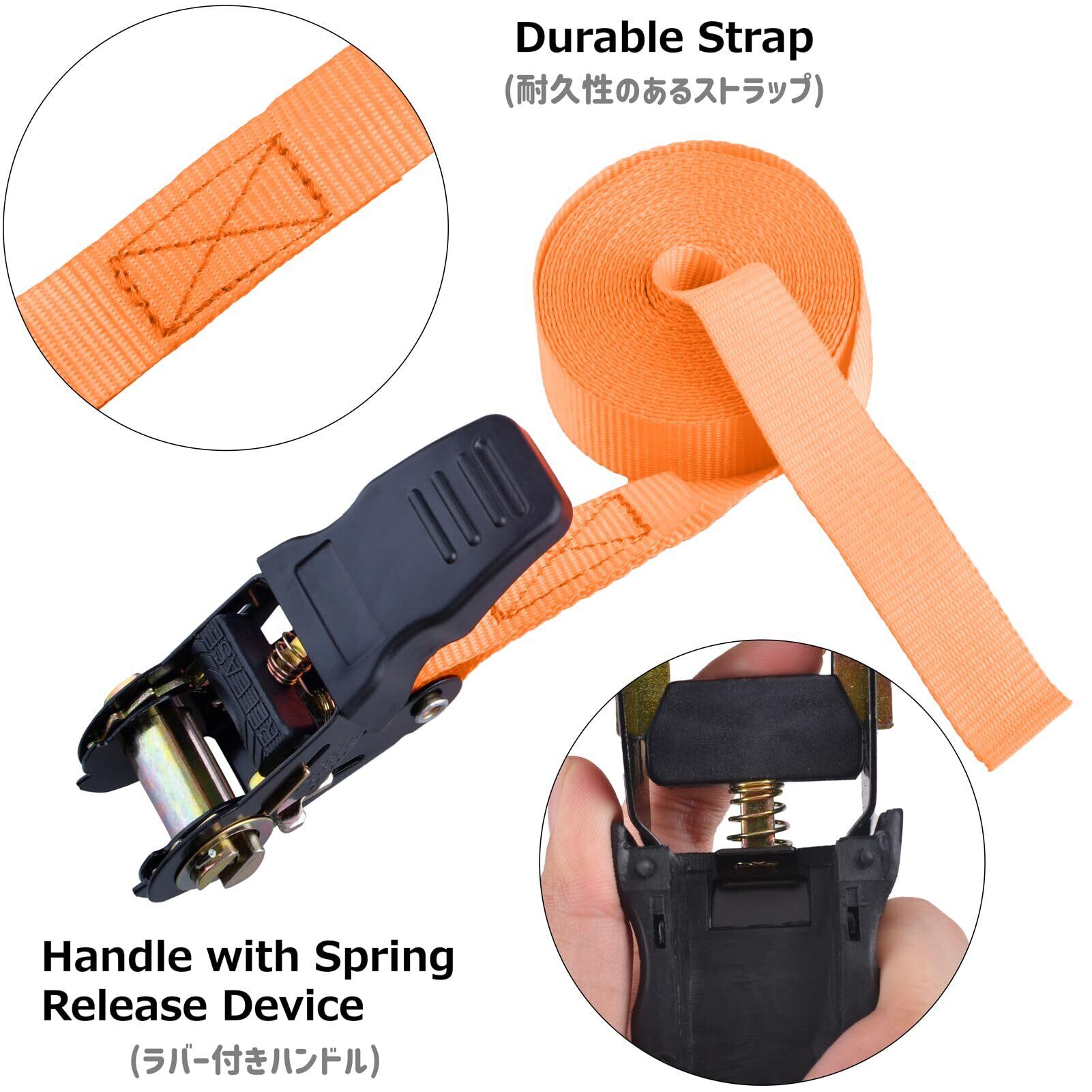 【材質】ベルト:強化したポリエステル、ラチェット金具:スチール、ハンドル:ラバー。高強度で耐食耐久性バッチリです