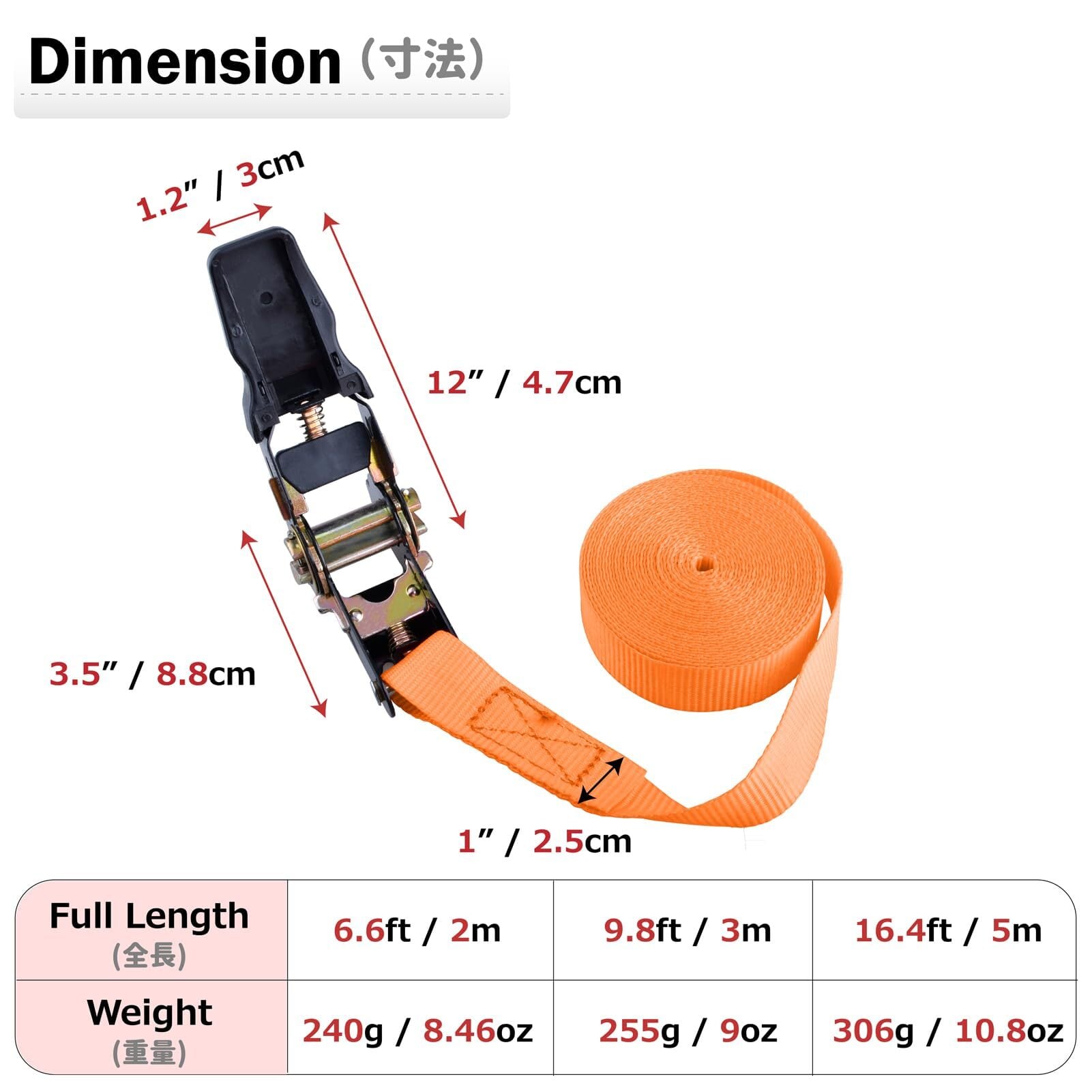 【寸法】荷締めベルト幅:2.5cm;長さ:2m、3m、5m、8m;カラー:ブラック、オレンジ;ラチェット式で使い便利です