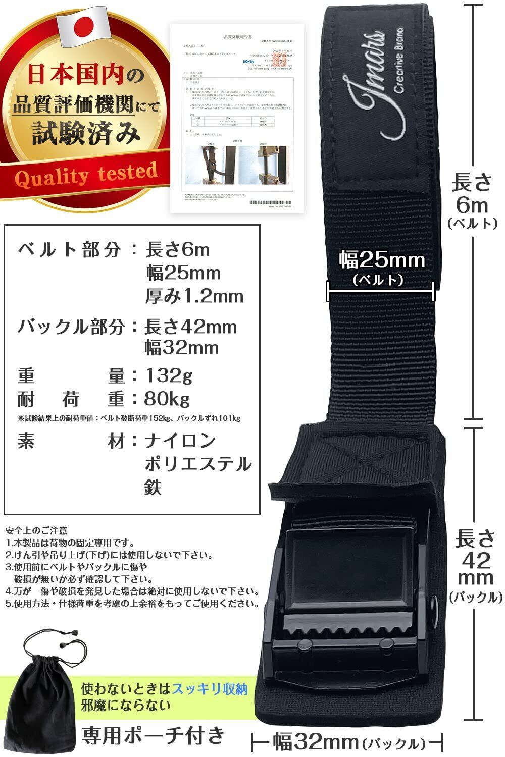 【スペック】 ベルト部分:長さ 6m (ハサミでカットすれば短くできます) 幅25mm 厚み1.2mm ・バックル部分:長さ42mm 幅32mm ・重量 132g ・耐荷重 80kg (試験結果上の耐荷重値:ベルト破断荷重152㎏、バックルずれ101kg )・素材:ナイロン、ポリエステル、鉄 ※耐荷重は測定値であり値ではありません。