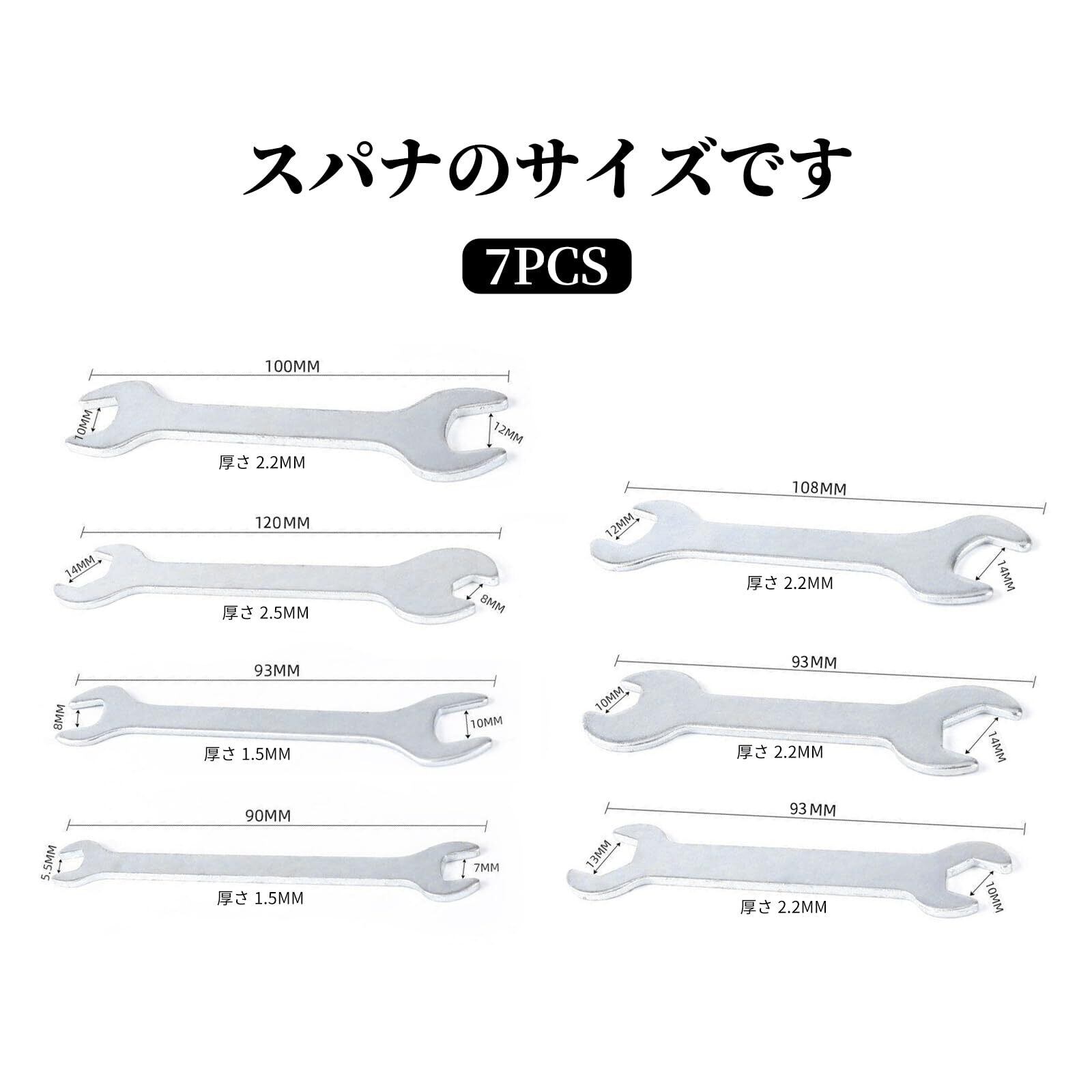 【商品仕様】:スパナセット7点セット、サイズ:7つのサイズ(5.5-7MM/8-10MM/8-14MM/10-12MM/10-13MM/10-14MM/12-14MM)詳細なサイズは画像で見ることができます。