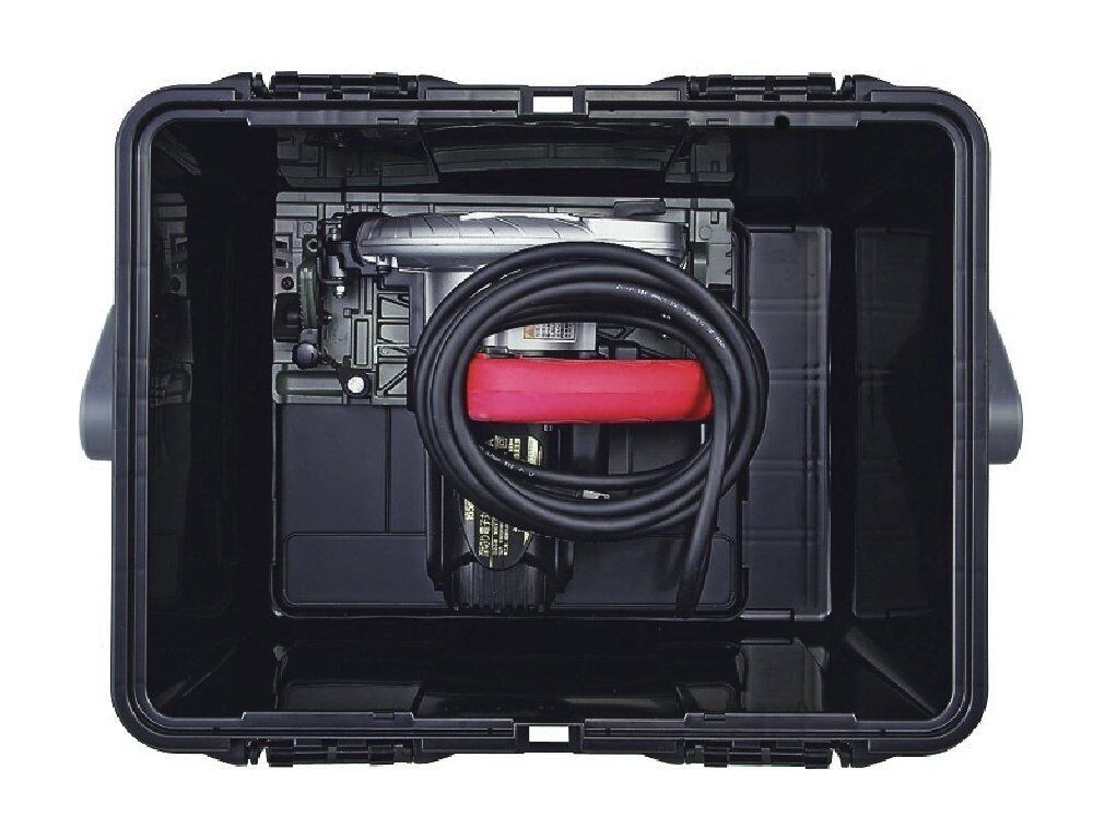 前後どちらからでも開閉でき、出し入れしやすいダブルオープンタイプ。丸のこ収納可能、中皿をひっくり返せば丸のこが水平収納可能な台座に変身。安定感ある持ちやすい大型ハンドル。フタ・本体ともリブ増強で強度抜群。
