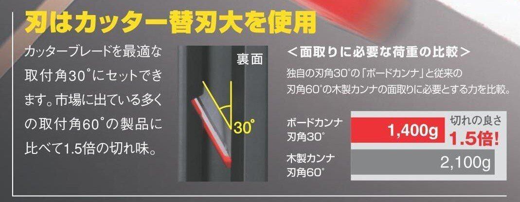 特長 刃はカッター替刃大(L型替刃)を半分に折って使用します。 取り付け角度は30°で従来の取付け角度60°の製品に比べ1.5倍の切れ味を実現しました。 滑りの良いフッ素コーティング加工を施し、従来の木製ボードカンナに比べ3倍の滑り良さを実現しました。 面取り幅を4段階で選べる調整板機構です。 高耐久アルミダイカストをベースに採用しているので変形せず摩耗にも強いです。 用途 30°面取り用。