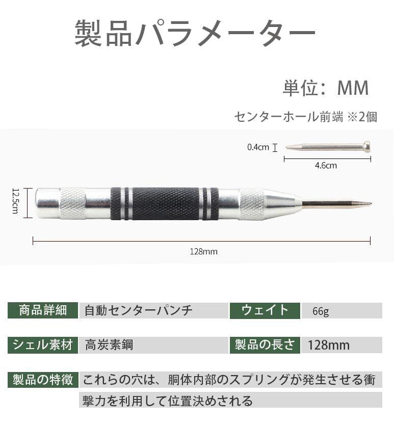 オートポンチオートポンチ工具-自動スプリング位置決め、ピンポンチ、センターポンチ センターポンチ オートポンチ オートポンチ 簡単操作、 1セット 予備針2本付き