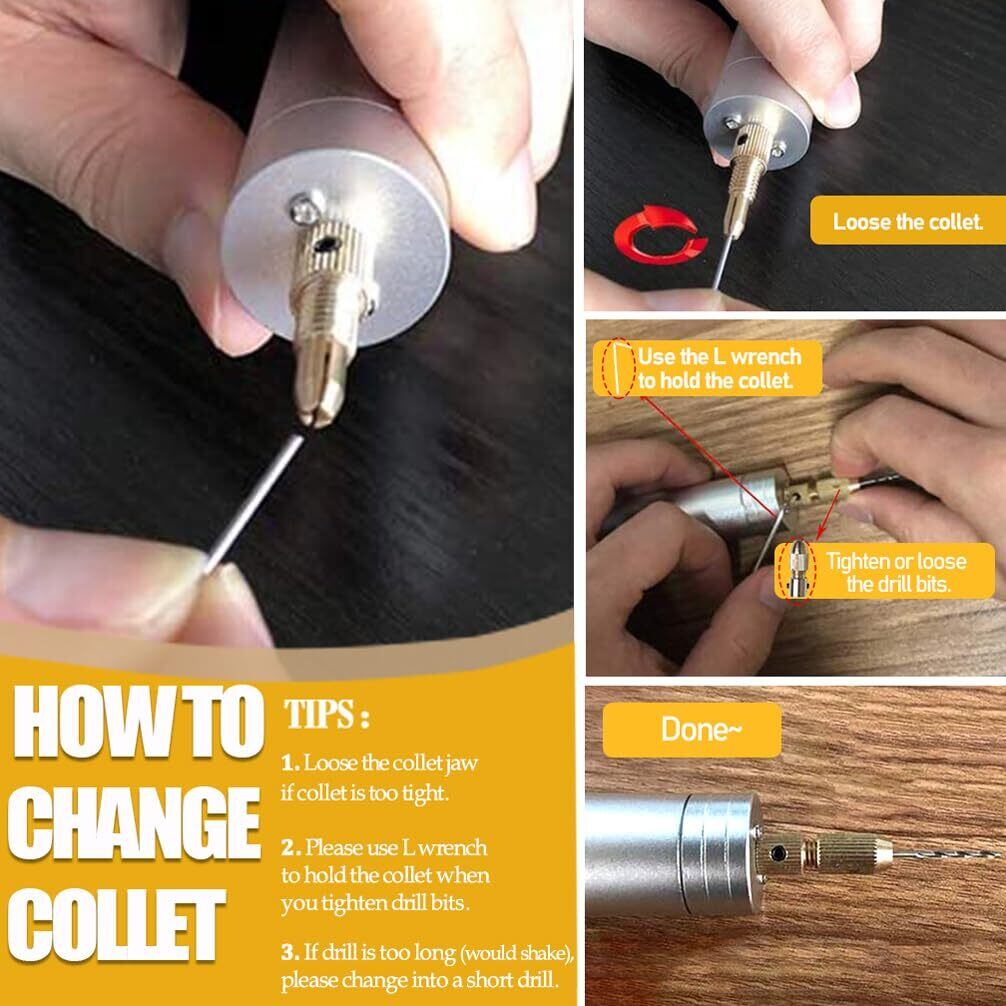 レジン用な便利工具、合計15個キット付ける:USBコード、5個異なるサイズのドリル(1mm 1.5mm 2mm 2.5mm, 3mm)、サンティングバンド、コレット5個付き(mm 1.8mm 2.1mm 2.8mm 3mm)、L型レンチ2本