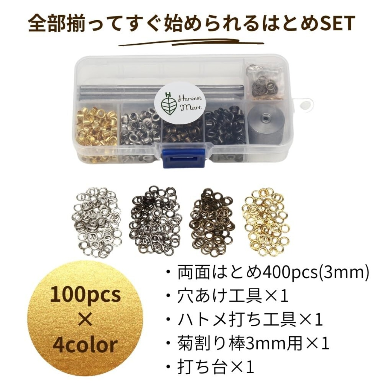 Harvestmart レザークラフト ハトメ セット はと目 ハトメ工具 菊割棒 穴あけポンチ ハトメ割りうち台 はとめセット 書付 (ハトメ3mm(両面ハトメ400set+はと目工具4set))