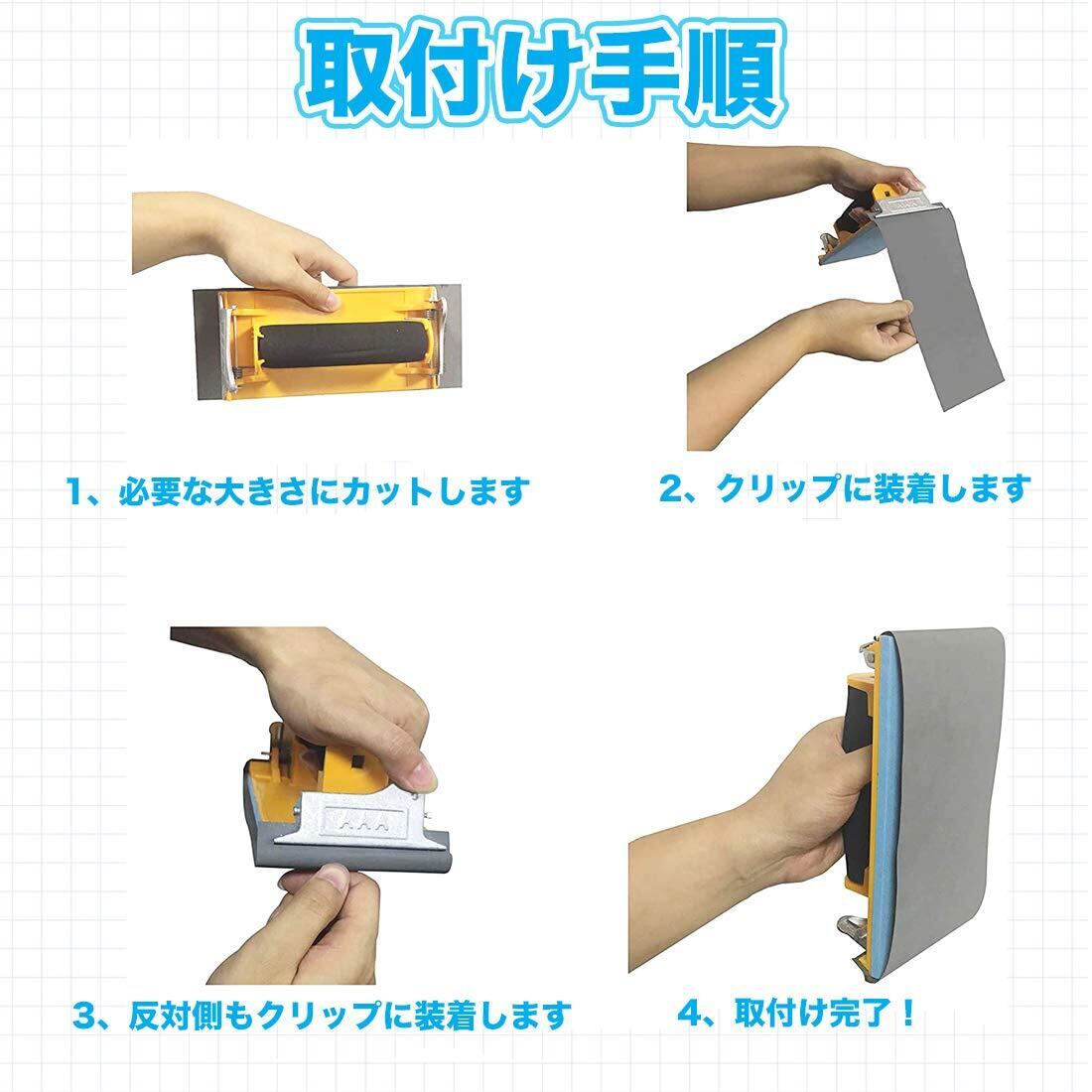・使用方法は①本体を紙やすりの端に置き必要な大きさを測ります。②紙やすりを必要な大きさにカットします。③クリップに紙やすりを装着します。