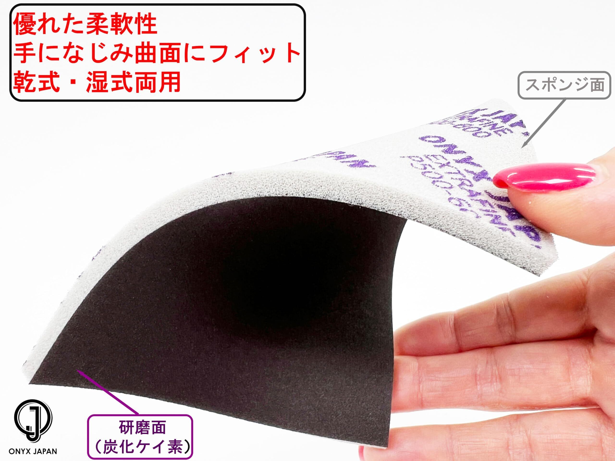 ONYX JAPANサンディングスポンジは耐久性の高い炭化ケイ素研磨剤でコーティングされ、従来の耐水研磨紙にはないクッション効果により手に良くなじみ、研磨の難しかった狭く複雑な形状や曲面にも良くフィット、使い勝手のよい研磨材です。