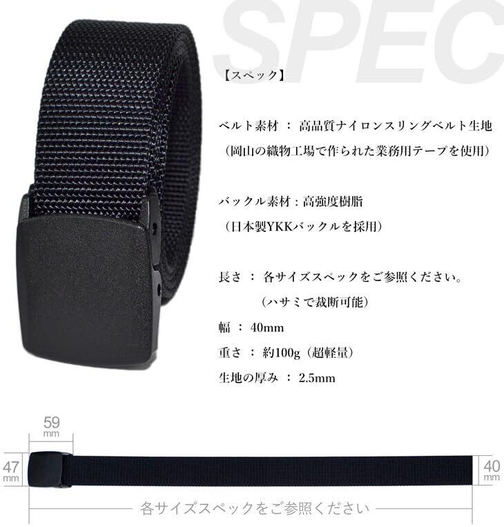 大きいサイズ ナイロンベルト 日本製 頑丈 丈夫 作業用 スリングベルト 非金属バックル YKK 40mm 複数サイズ フリーサイズ 調整可能 (ブラック)