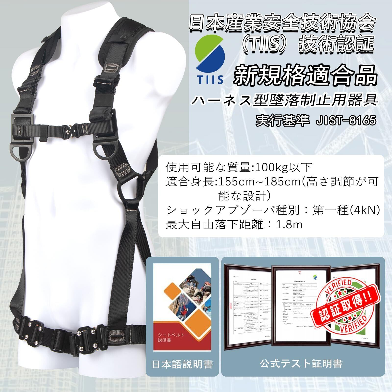 【製品仕様】ハーネスの重量は約1.1kg、身長に適しています:150cm〜185cm(高さ調整が可能である)、太もも周囲:45cm〜90cm、最大耐荷重:100kg。