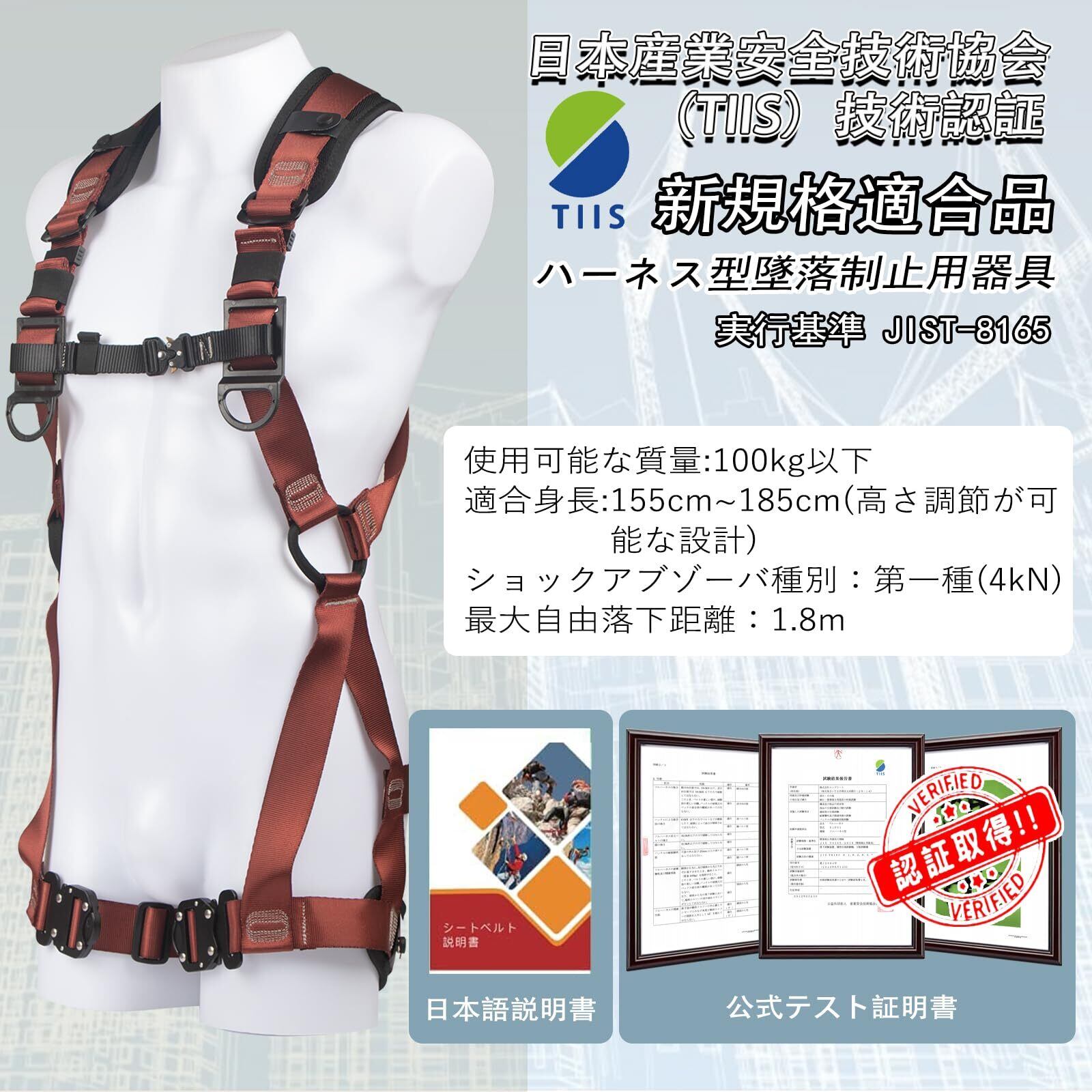 ハーネスの重量は約1.1kg、身長に適しています:150cm〜185cm(高さ調整が可能である)、太もも周囲:45cm〜90cm、最大耐荷重:100kg。