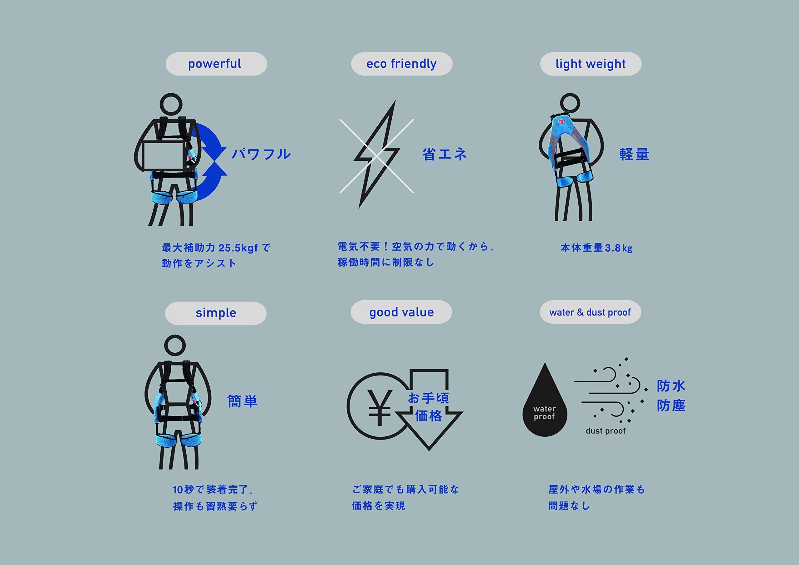 重量物を扱う際や中腰の姿勢での作業をする際の腰への負担を軽減します。腕への負担は変わりません。