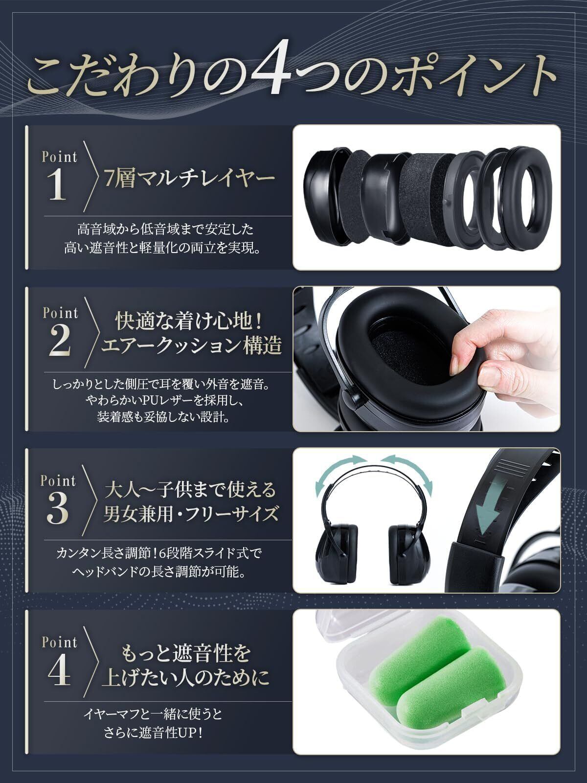 【7層マルチレイヤーを搭載】遮音効果を高める多層構造により、高音域から低音域までの広い音域をカバー。騒音対策、読書、勉強時の防音など、幅広いシーンに対応したイヤーマフです。