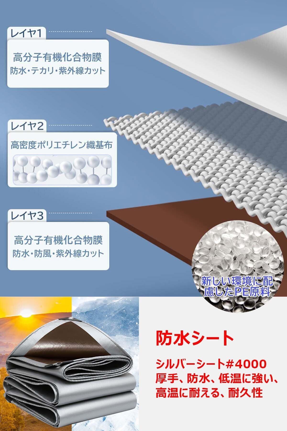 【商品仕様】防水シート シルバーシート #4000 厚手 防水 屋外 屋根 バルコニー用。防水シート実際のサイズ:約1.9m*2.9m、じゅうりょう:約1.08キログラム。商品の厚さ:約0.4mm、両面カラー:シルバーとコーヒーカラー。複数のサイズ、寒さ熱さに耐久があり、耐久性,用途が広い。直径5 mm、長さ約10 mの黒いひもを贈ります
