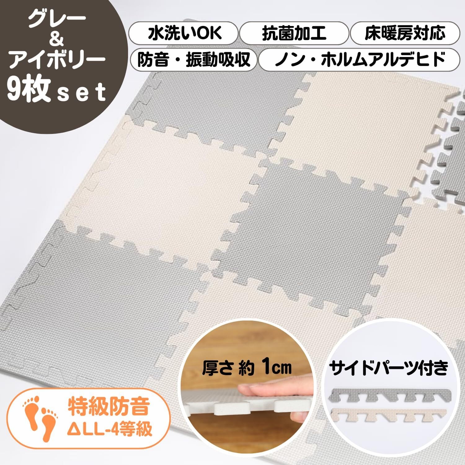 ユノックス ジョイントマット 30×30cm 厚さ約1cm 9枚セットグレー5枚 / アイボリー4枚 フチ付き ノン・ホルムアルデヒド 抗菌加工 床暖房対応 水洗いOK 防音 振動吸収 床保護 キズ防止 床材