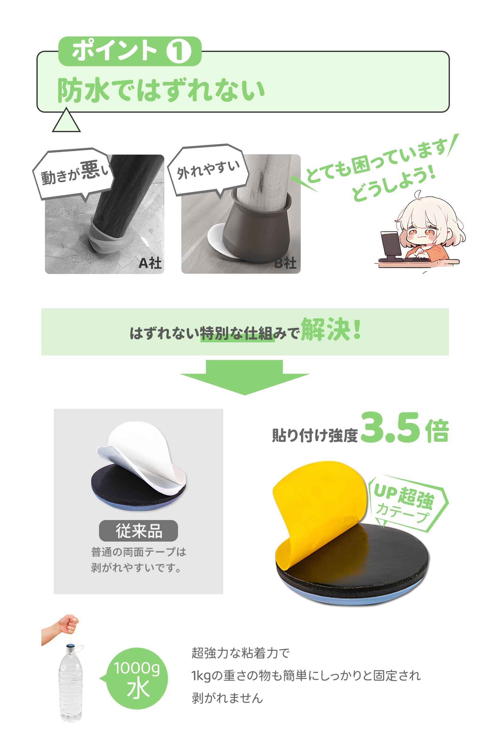 「4️⃣ 簡単装着で長持ち」: 椅子脚カバー 滑るタイプ 3M製強力両面テープを採用!信頼の接着力で、長期間の安心使用が可能です