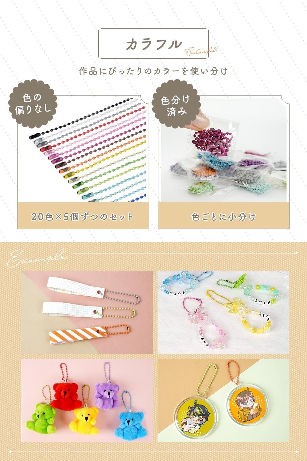 【便利なコネクター付き&耐久性抜群】 チェーン長さ12cm、ボール径2.4mmの設計で、キーホルダーやアクセサリーパーツとして使いやすい最適なサイズ感! さらに、コネクター付きで簡単に連結可能。丈夫な素材を採用しているため、繰り返しの使用にも耐えられる高い耐久性を実現。ハンドメイド作品から日常使いまで幅広く活躍します
