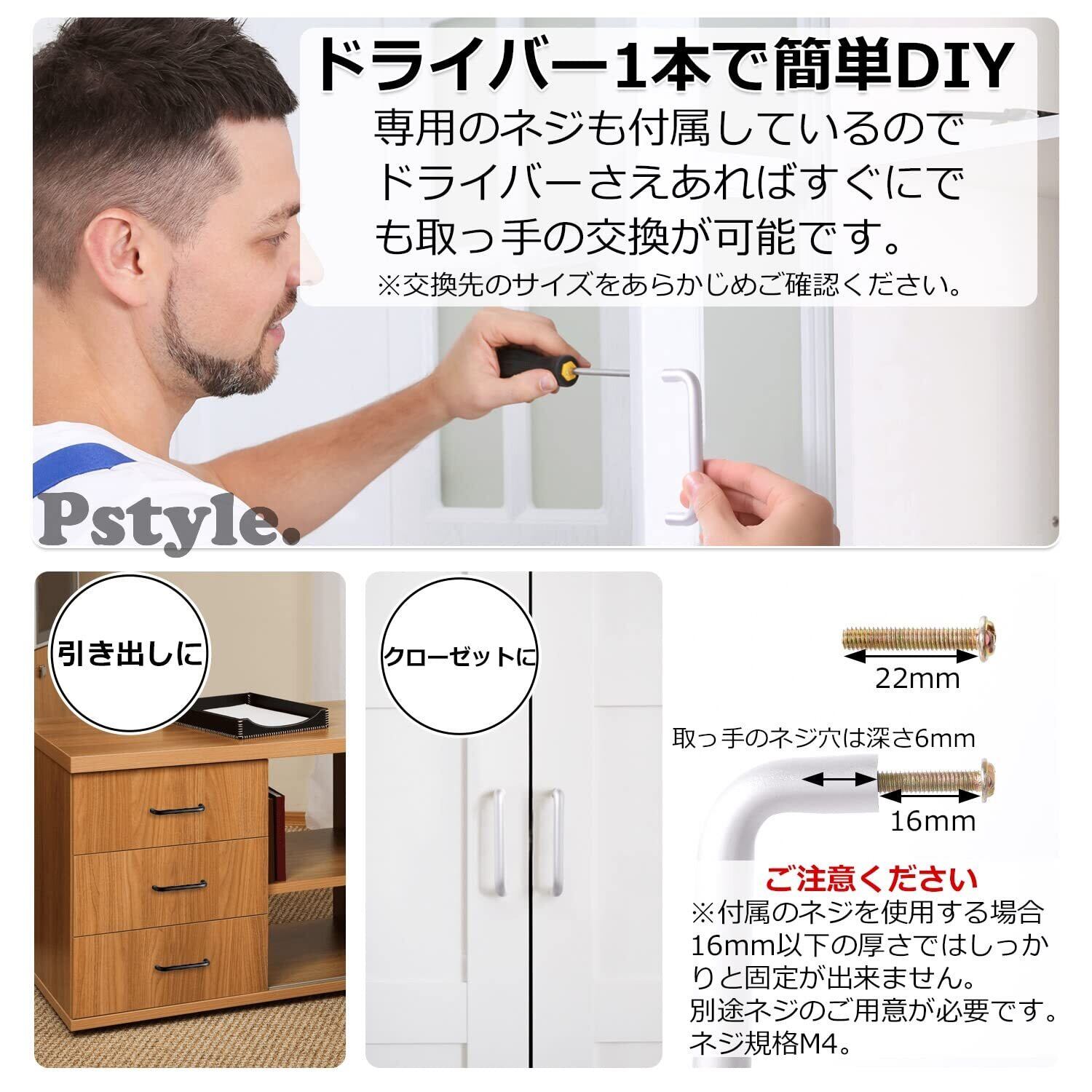 【対応する引き出しやたんす】 付属のネジを使用する場合、取っ手のネジ穴の深さが6mmとなります。ひきだしの厚さが16mm以下20mm以上の場合、別途ネジをご用意ください。*交換先のサイズをあらかじめご確認ください。