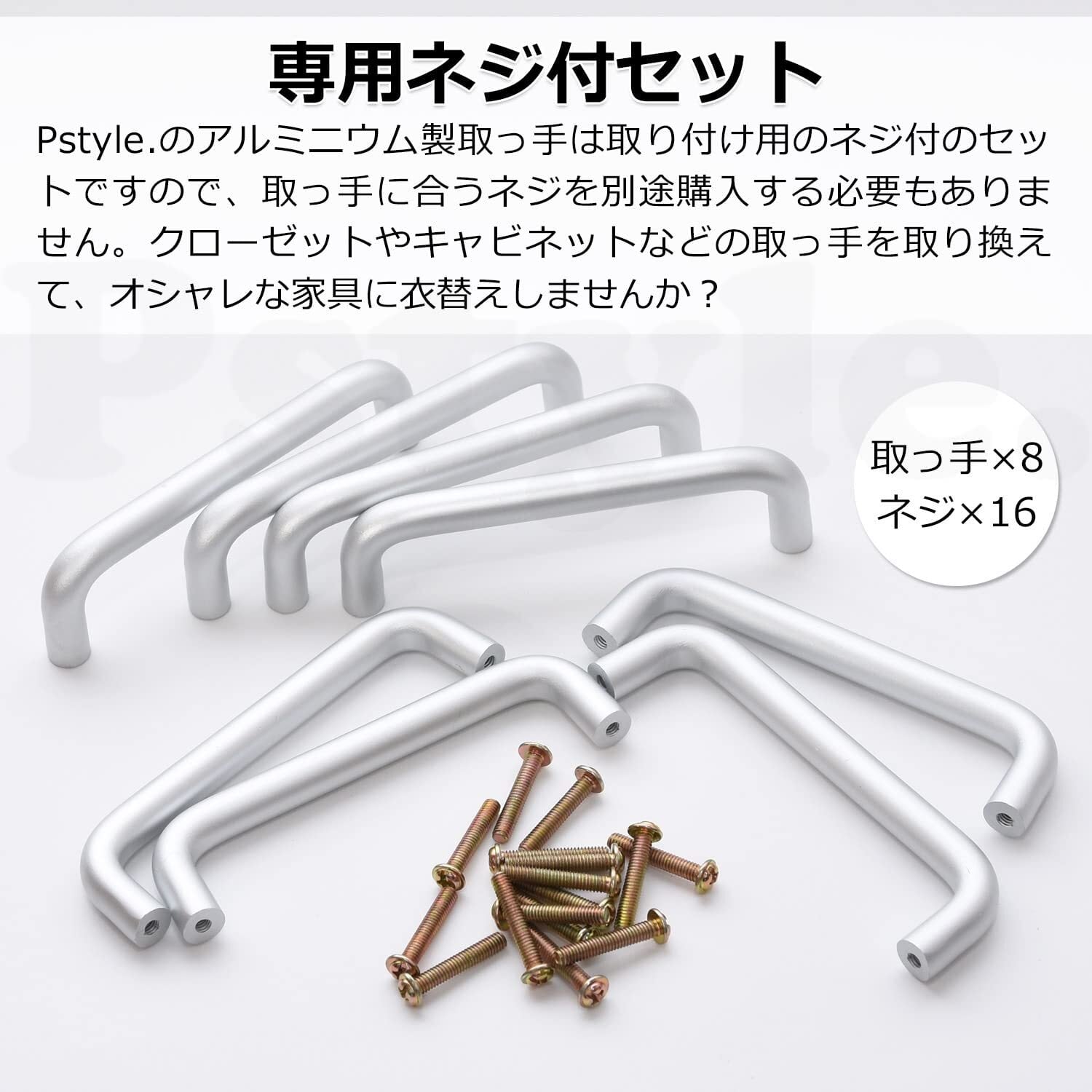 【専用ネジ付きセット】 Pstyle.のアルミニウム製とっては、取り付け用ネジが付属しています。ドライバーさえあれば、すぐにでも取手の交換が可能です。キッチン、キャビネット、食器棚など、幅広く使いやすいデザインです。