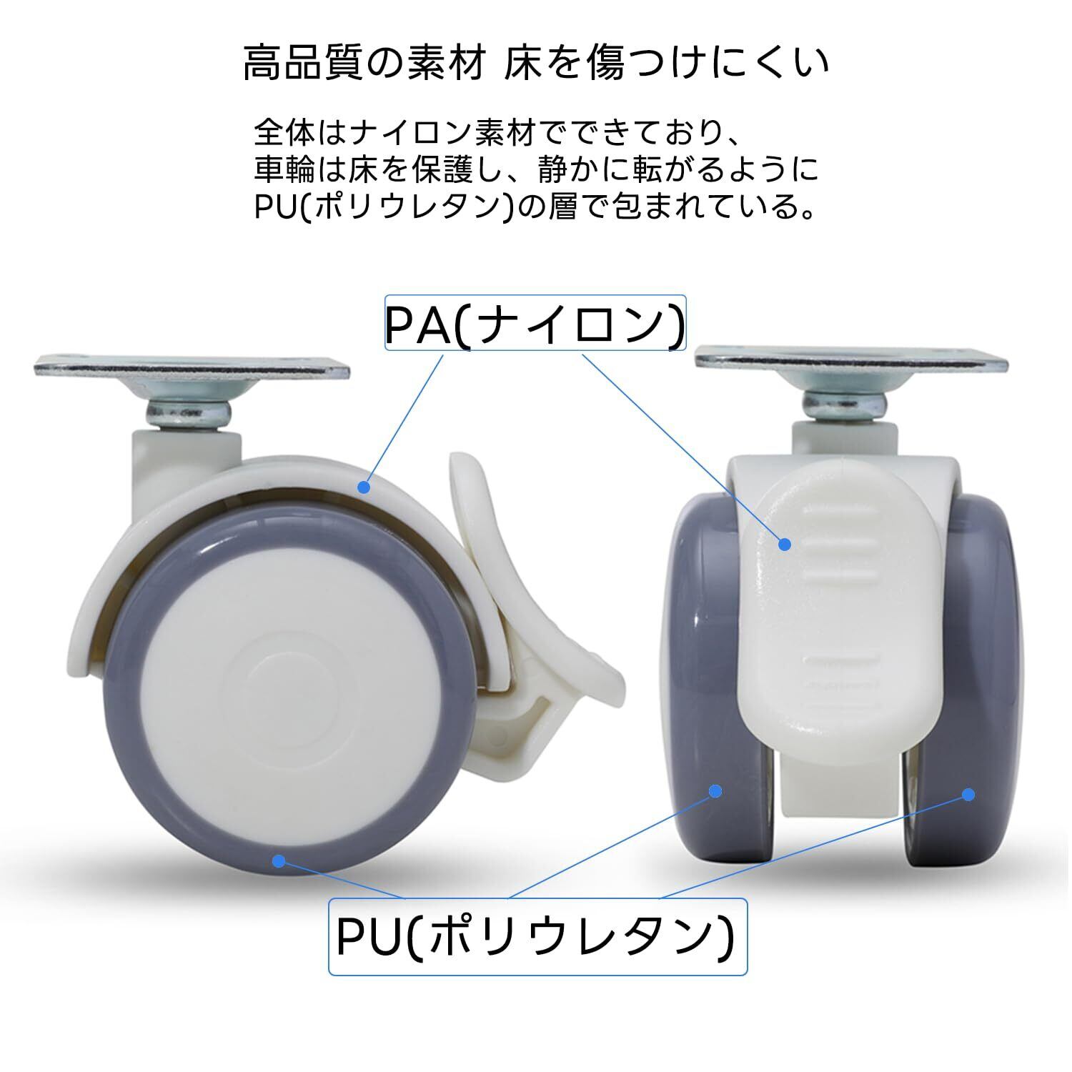 【耐荷重・床を保護】全体がナイロン素材でできており、耐荷重が良い(1個あたり約50kg、4個合わせて200kgまでです)。床と接触する部分はポリウレタンで包まれ、床が柔らかいときに形が残らなくて、キャスターも静かで滑らかです。取付高さが低く、安定感のある双輪で滑らかな回転機能と優れた耐久性を備えたキャスターです。