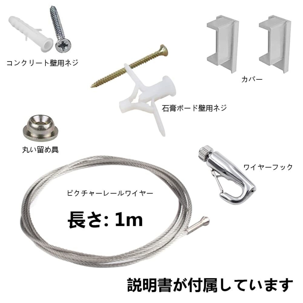 【付属品】:ピクチャーレール本体1m2本、ピクチャーレールワイヤー1m4本、カバー4個、丸い留め具7個、コンクリート壁用ネジ7個、拡張パイプ(コンクリート壁用)7個、石膏ボード壁用ネジ7個、拡張パイプ(石膏ボード壁用)7個、日本語取扱説明書1本。製品重量0.9kg。