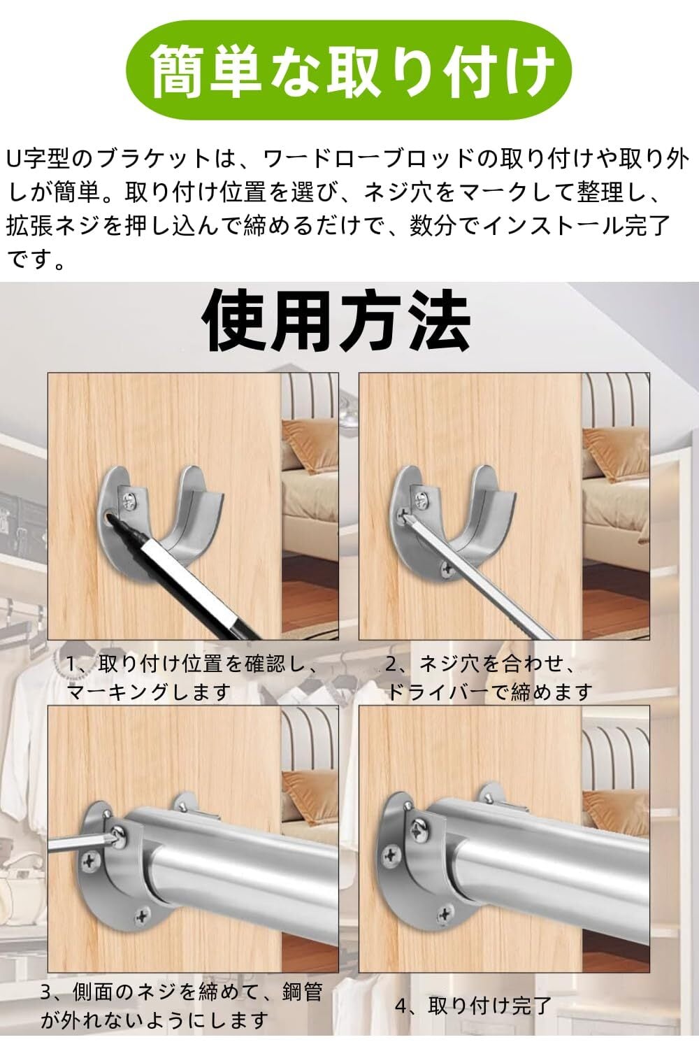 【簡単な取り付け】U字型のブラケットは、ワードローブロッドの取り付けや取り外しが簡単。取り付け位置を選び、ネジ穴をマークして整理し、拡張ネジを押し込んで締めるだけで、数分でインストール完了です。